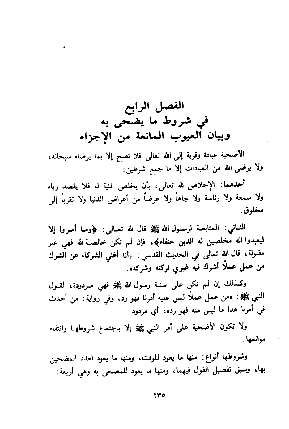 الفصل الرابع في شروط ما يضحى به، وبيان العيوب المانعة من الإجزاء