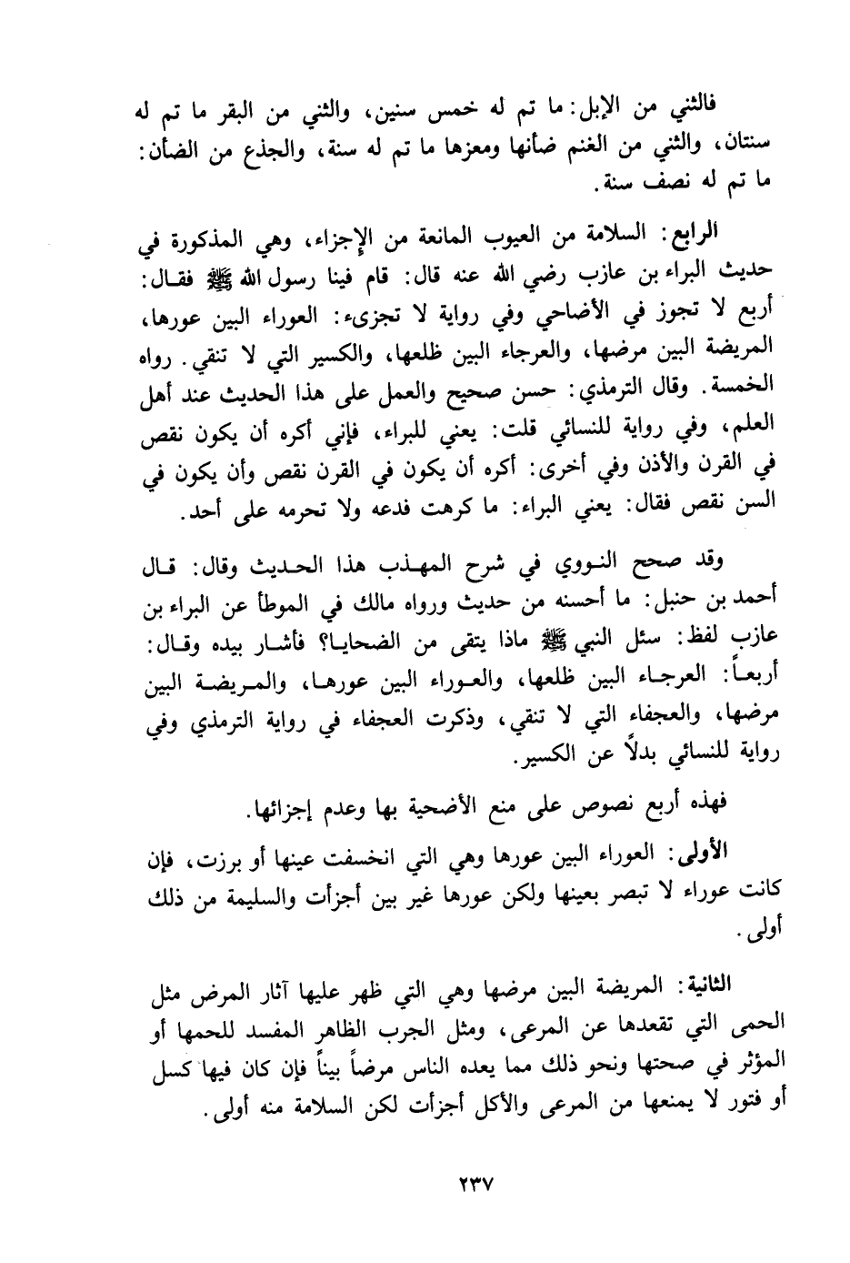 الرابع: السلامة من العيوب المانعة من الإجزاء، وهي المذكورة في حديث البراء بن عازب رضي الله عنه قال: قام فينا رسول الله صلى الله عليه وسلم فقال: ((أربع لا تجوز في الأضاحي ـ وفي رواية: لا تجزئ ـ: العوراء البين عورها، والمريضة البين مرضها، والعرجاء البين ظلعها، والكسير التي لا تنقي)) . رواه الخمسة. وقال الترمذي: حسن صحيح (¬1) . والعمل على هذا الحديث عند أهل العلم، وفي رواية للنسائي قلت: ـ يعني للبراء ـ فإني أكره أن يكون نقص في القرن، وفي أخري أكره أن يكون في القرن نقص، أو أن يكون في السن نقص، فقال ـ يعنى البراء ـ: ما كرهت فدعه ولا تحرمه على أحد (¬2) .