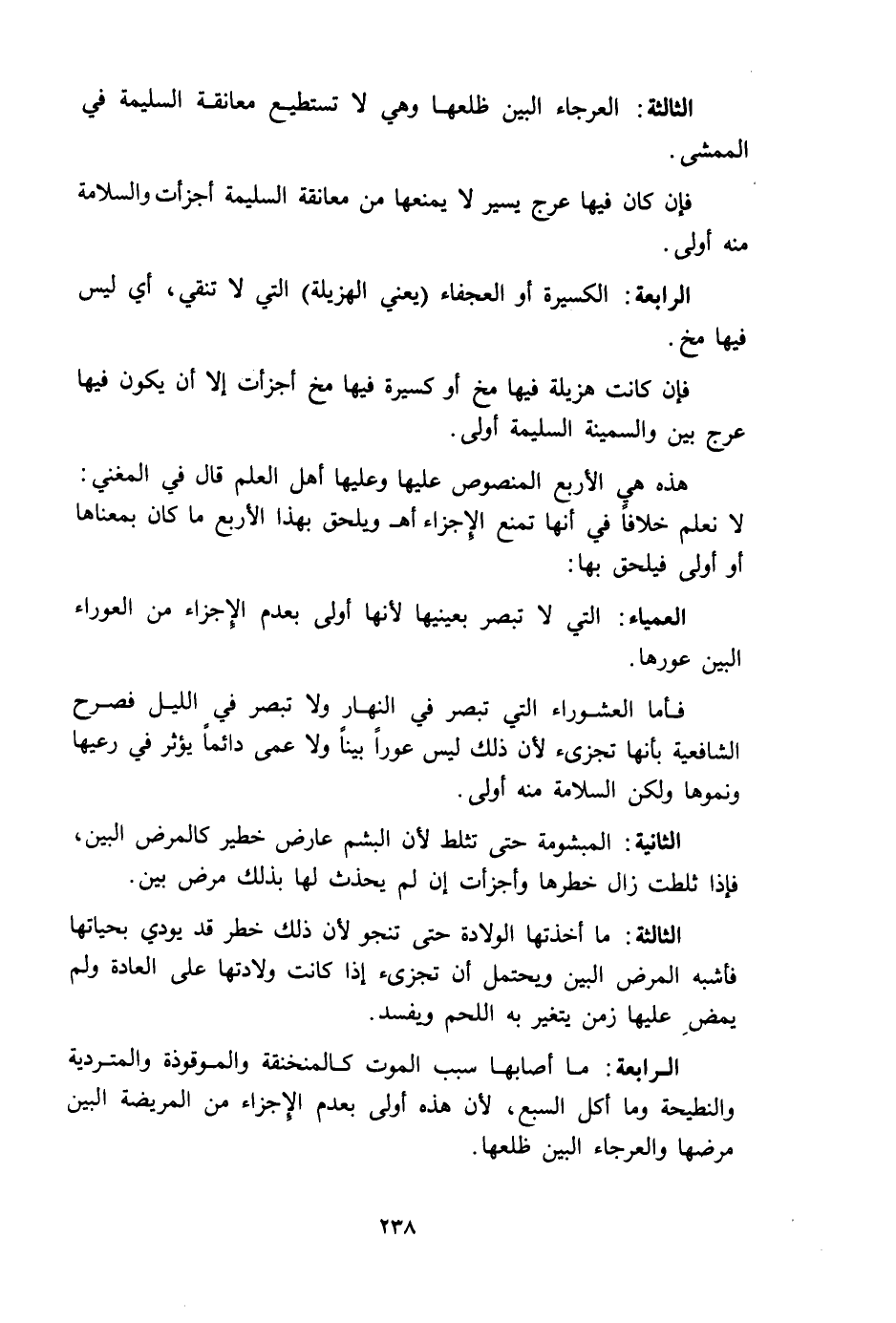 الثالثة: العرجاء البين ظلعها، وهي التي لا تستطيع معانقة السليمة في الممشى، فإن كان فيها عرج يسير لا يمنعها من معانقة السليمة أجزأت، والسلامة منه أولى.