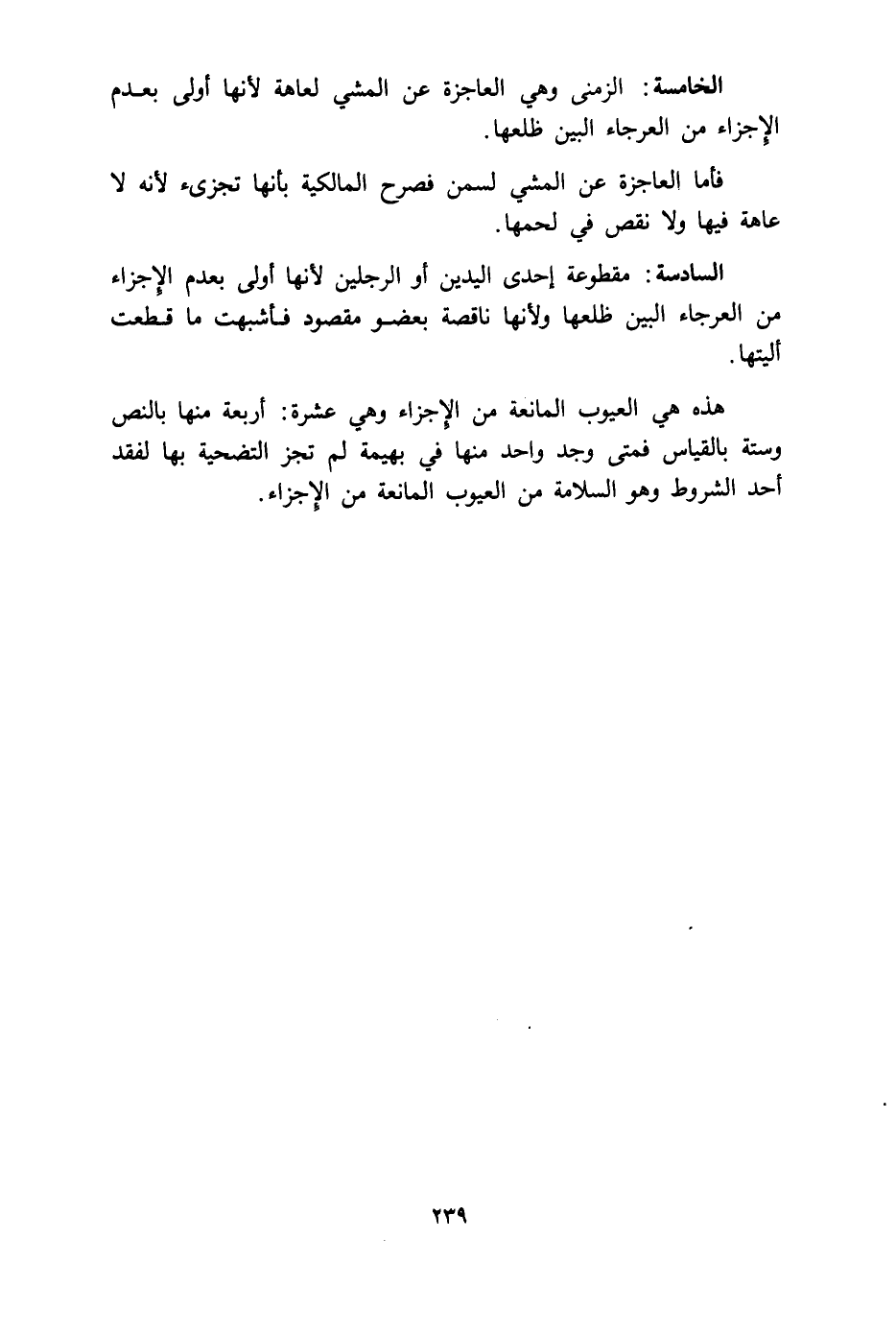 هذه هي العيوب المانعة من الإجزاء وهي عشرة: أربعة منها بالنص وستة بالقياس، فمتى وجد واحد منها في بهيمة لم تجز التضحية بها؛ لفقد أحد الشروط وهو السلامة من العيوب المانعة من الإجزاء.