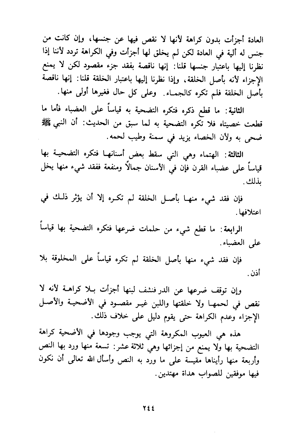 هذه هي العيوب المكروهة التي يوجب وجودها في الأضحية كراهة التضحية بها، ولا يمنع من إجزائها وهي ثلاثة عشر: تسعة منها ورد بها النص، وأربعة منها رأيناها مقيسة على ما ورد به النص، وأسأل الله تعالى أن نكون فيها موفقين للصواب هداة مهتدين.