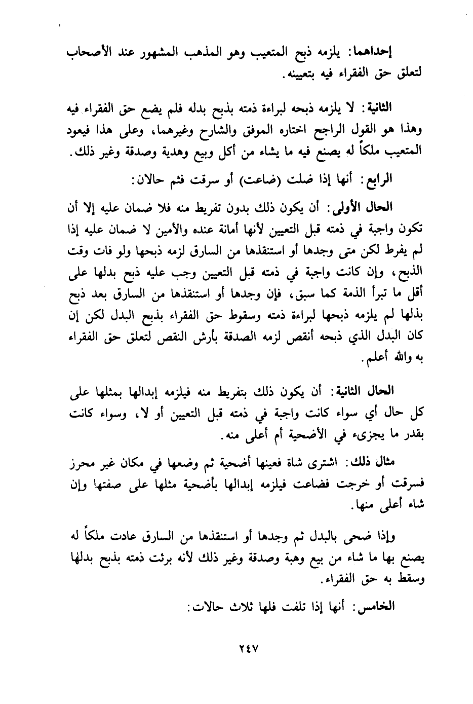 الحال الأولى: أن يكون ذلك بدون تفريط منه فلا ضمان عليه إلا أن تكون واجبة في ذمته قبل التعيين؛ لأنها أمانة عنده، والأمين لا ضمان عليه إذا لم يفرط، لكن متى وجدها أو استنقذها من السارق؛ لزمه ذبحها ولو فات وقت الذبح، وإن كانت واجبة في ذمته قبل التعيين وجب عليه ذبح بدلها على أقل ما تبرأ به الذمة كما سبق، فإن وجدها أو استنقذها من السارق بعد ذبح بدلها لم يلزمه ذبحها لبراءة ذمته، وسقوط حق الفقراء بذبح البدل، لكن إن كان البدل الذي ذبحه أنقص لزمه الصدقة بأرش النقص؛ لتعلق حق الفقراء به، والله أعلم.