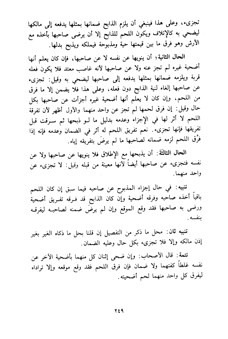 الحال الثانية: أن ينويها عن نفسه لا عن صاحبها، فإن كان يعلم أنها أضحية غيره لم تجز عنه ولا عن صاحبها؛ لأنه غاضب معتد فلا يكون فعله قربة، ويلزمه ضمانها بمثلها يدفعه إلى صاحبها ليضحي به وقيل: تجزئ عن صاحبها إلغاء لنية الذابح دون فعله، وعلى هذا فلا يضمن إلا ما فرق من اللحم، وإن كان لا يعلم أنها أضحية غيره؛ أجزأت عن صاحبها بكل حال، وقيل: إن فرق لحمها لم تجز عن واحد منهما، والأول أظهر؛ لأن تفرقه اللحم لا أثر لها في الإجزاء وعدمه؛ بدليل ما لو ذبحها ثم سرقت قبل تفريقها فإنها تجزئ. نعم تفريق اللحم له أثر في الضمان وعدمه، فإنه إذا فرق اللحم؛ لزمه ضمانه لصاحبها ما لم يرض بتفريقه إياه.