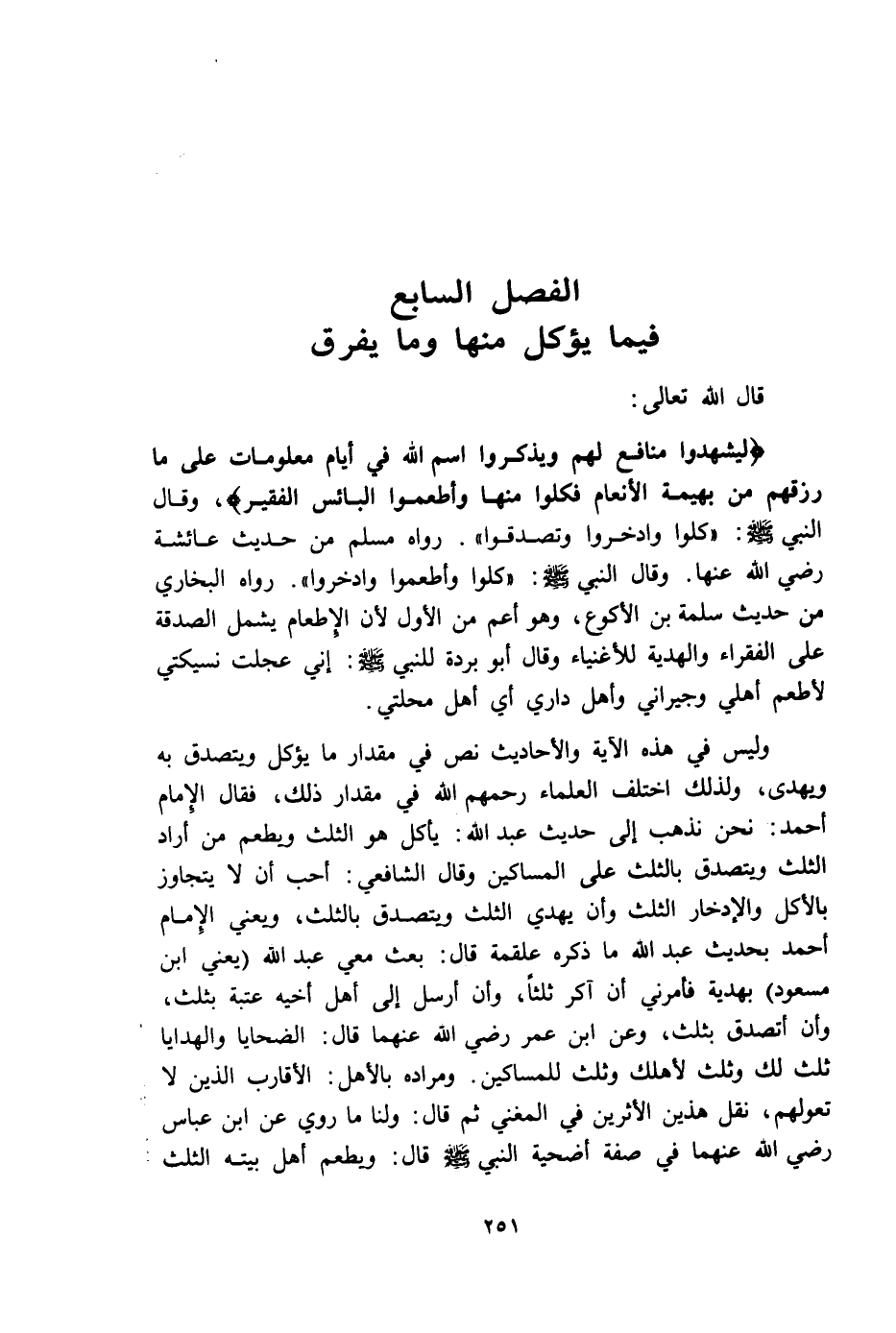 وليس في هذه الآية والأحاديث نص في مقدار ما يؤكل ويتصدق به ويهدى، ولذلك اختلف العلماء ـ رحمهم الله ـ في مقدار ذلك، فقال الإمام أحمد: نحن نذهب إلى حديث عبد الله: يأكل هو الثلث، ويطعم من أراد الثلث، ويتصدق بالثلث على المساكين، وقال الشافعي: أحب أن لا يتجاوز بالأكل والادخار الثلث، وأن يهدي الثلث، ويتصدق بالثلث، ويعني الإمام أحمد بحديث عبد الله ما ذكره علقمة قال بعث معي عبد الله ـ يعني ابن مسعود ـ بهدية فأمرني أن آكل ثلثا، وأن أرسل إلى أهل أخيه عتبة بثلث، وأن أتصدق بثلث (¬4) ، وعن ابن عمر ـ رضي الله عنهما ـ قال: الضحايا والهدايا: ثلث لك، وثلث لأهلك، وثلث للمساكين. ومراده بالأهل: الأقارب الذين لا تعولهم، نقل هذين الأثرين في ((المغني)) ثم قال: ولنا ما روي عن ابن عباس ـ رضي الله عنهما ـ في صفة أضحية النبي صلى الله عليه وسلم قال: ويطعم أهل بيته الثلث،