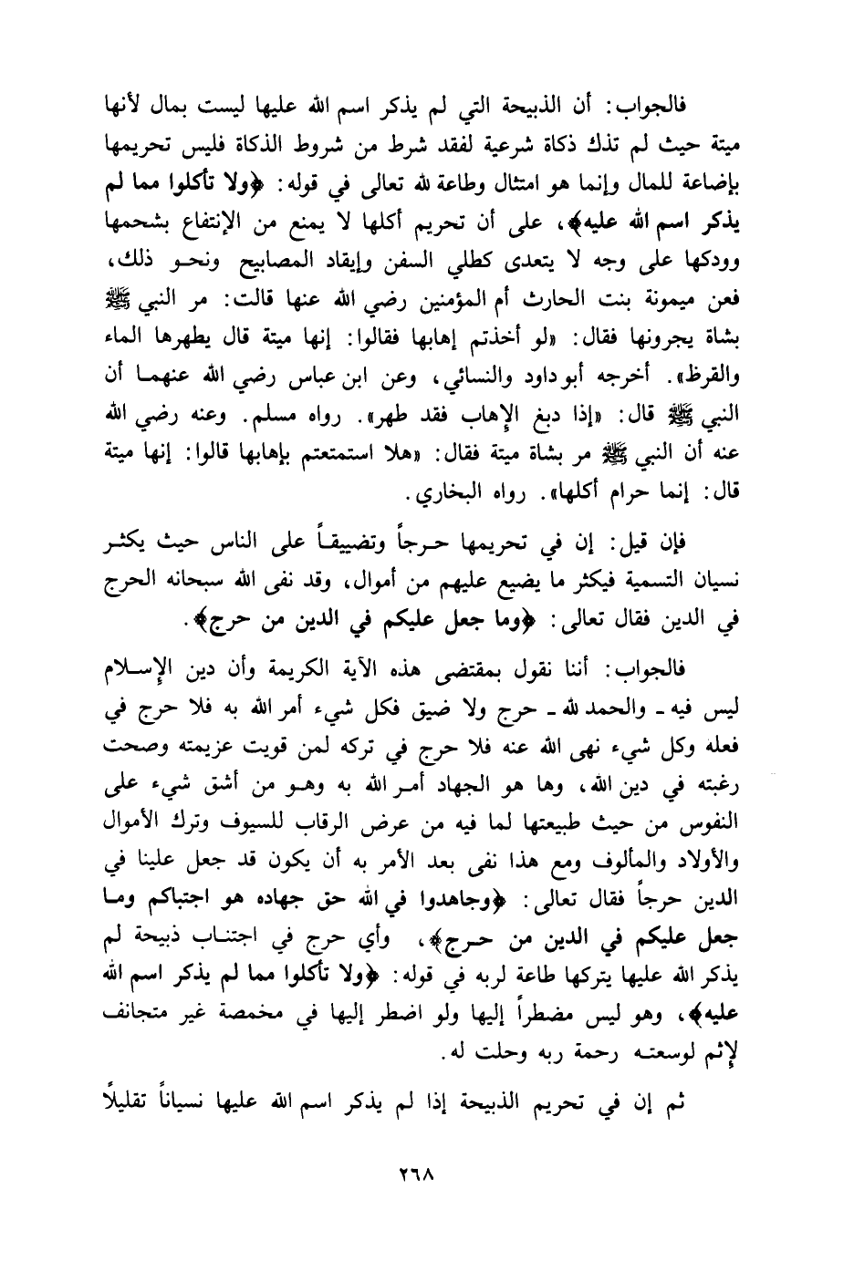 فإن قيل: إن في تحريمها حرجا وتضييقا على الناس حيث يكثر نسيان التسمية فيكثر ما يضيع عليهم من أموالهم، وقد نفى الله سبحانه الحرج في الدين فقال تعالى: (وَمَا جَعَلَ عَلَيْكُمْ فِي الدِّينِ مِنْ حَرَجٍ) (الحج: 78) .