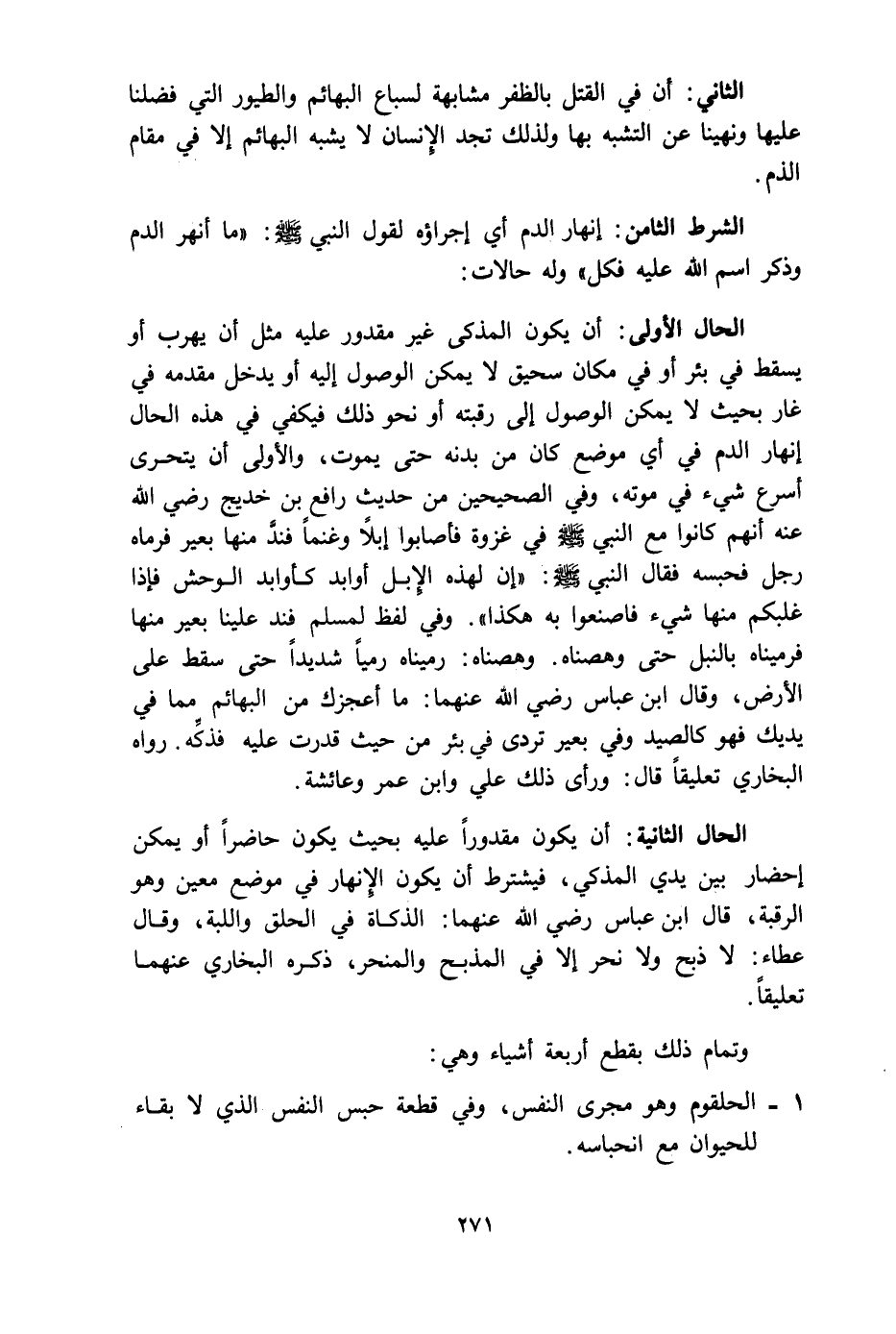 الحال الأولى: أن يكون المذكي غير مقدور عليه، مثل أن يهرب أو يسقط في بئر أو في مكان سحيق لا يمكن الوصول إليه، أو يدخل مقدمه في غار بحيث لا يمكن الوصول إلى رقبته أو نحو ذلك فيكفي في هذه الحال إنهار الدم في أي موضع كان من بدنه حتى يموت، والأولى أن يتحرى أسرع شيء في موته، وفي ((الصحيحين)) من حديث رافع بن خديج رضي الله عنه أنهم كانوا مع النبي صلى الله عليه وسلم في غزوة فأصابوا إبلاً وغنماً فند منها بعير فرماه رجل فحبسه، فقال النبي صلى الله عليه وسلم: ((إن لهذه الإبل أوابد الوحش، فإذا غلبكم منها شيء فاصنعوا به هكذا)) (¬2) . وفي لفظ لمسلم: فند علينا بعير منها فرميناه بالنبل حتى وهصناه. وهصناه (¬3) : رميناه رميا شديدا حتى سقط على الأرض، قال ابن عباس رضي الله عنهما: ما أعجزك من البهائم مما في يديك فهو كالصيد، وفي بعير تردى في بئر من حيث قدرت عليه فذكه. رواه البخاري تعليقا. قال: ورأى ذلك علي وابن عمر وعائشة (¬4) .