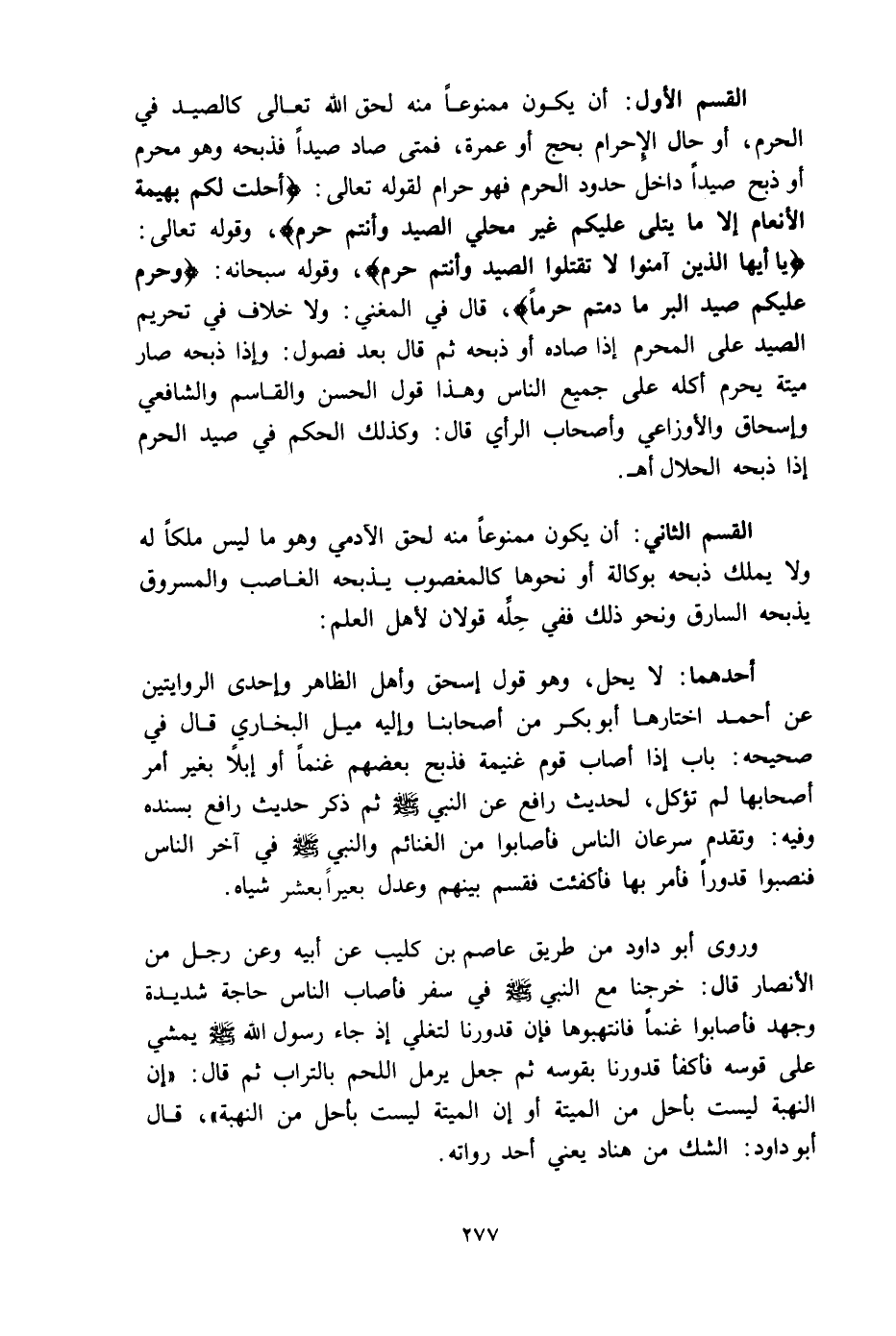 أحدهما: لا يحل، وهو قول إسحاق، وأهل الظاهر، وإحدى الروايتين عن أحمد، اختارها أبو بكر من أصحابنا، وإليه ميل البخاري، قال في ((صحيحه)) : باب إذا أصاب قوم غنيمة فذبح بعضهم غنما أو إبلا بغير أمر أصحابها لم تؤكل؛ لحديث رافع عن النبي صلى الله عليه وسلم ثم ذكر حديث رافع بسنده وفيه: وتقدم سرعان الناس فأصابوا من الغنائم والنبي صلى الله عليه وسلم في آخر الناس فنصبوا قدورا، فأمر بها فأكفئت فقسم بينهم وعدل بعيراً بعشرة شياه (¬1) .
