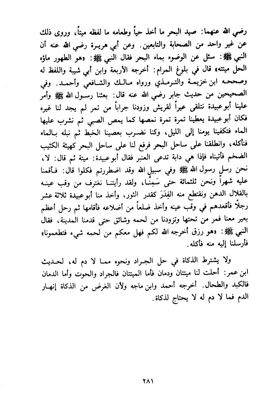 رضي الله عنهما: صيد البحر ما أخذ حياً، وطعامه ما لفظه ميتاً، وروى ذلك عن غير واحد من الصحابة والتابعين. وعن أبي هريرة رضي الله عنه أن النبي صلى الله عليه وسلم سئل عن الوضوء بماء البحر، فقال النبي صلى الله عليه وسلم: ((هو الطهور ماؤه الحل ميتته)) قال في ((بلوغ المرام)) : أخرجه الأربعة وابن أبي شيبة واللفظ له، وصححه ابن خزيمة والترمذي، ورواه مالك والشافعي وأحمد (¬1) .