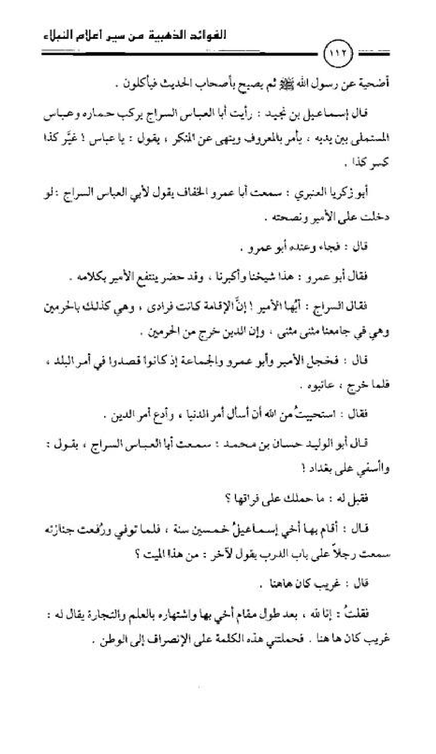 قال أبو الوليد حسان بن محمد: سمعت أبا العباس السراج، يقول: واأسفي على بغداد!