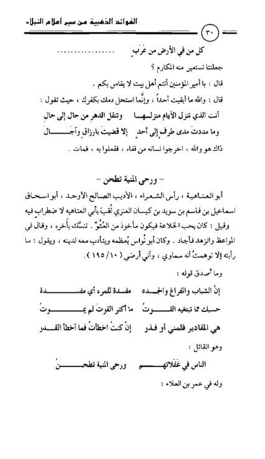 أبو العتاهية، رأس الشعراء، الأديب الصالح الأوحد، أبو إسحاق إسماعيل بن قاسم بن سويد بن كيسان العنزي لُقبَ بأبي العتاهية لاضطراب فيه، وقيل: كان يحب الخلاعة فيكون مأخوذًا من العُتُو. تنسك بأخرة، وقال في المواعظ والزهد فأجاد، وكان أبو نُواس يعظمه ويتأدب معه لدينه، ويقول: ما رأيته إلا توهمتُ أنه سماوي، وأني أرضي (10/ 195).