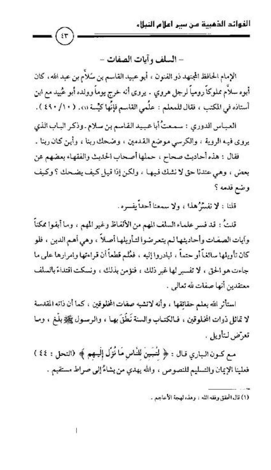 العباس الدوري: سمعتُ أبا عبيد القاسم بن سلام، وذكر الباب الذي يروى فيه الروية، والكرسي موضع القدمين، وضحك ربنا، وأين كان ربنا. فقال: هذه أحاديث صحاح، حملها أصحاب الحديث والفقهاء بعضهم عن بعض، وهي عندنا حق لا نشك فيها، ولكن إذا قيل كيف يضحك؟ وكيف وضع قدمه؟