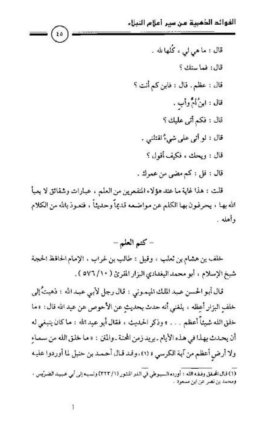 قال أبو الحسن عبد الملك الميموني: قال رجل لأبي عبد الله: ذهبتُ إلى خلف البزار أعظه، بلغني أنه حدث بحديث عن الأحوص عن عبد الله قال: «ما خلق الله شيئًا أعظم ..» وذكر الحديث فقال أبو عبد الله: ما كان ينبغي له أن يحدث بهذا في هذه الأيام يريد زمن المحنة والمتن: «ما خلق الله من سماء ولا أرض أعظم من آية الكرسي» (¬1) وقد قال أحمد بن حنبل لما أوردوا عليه