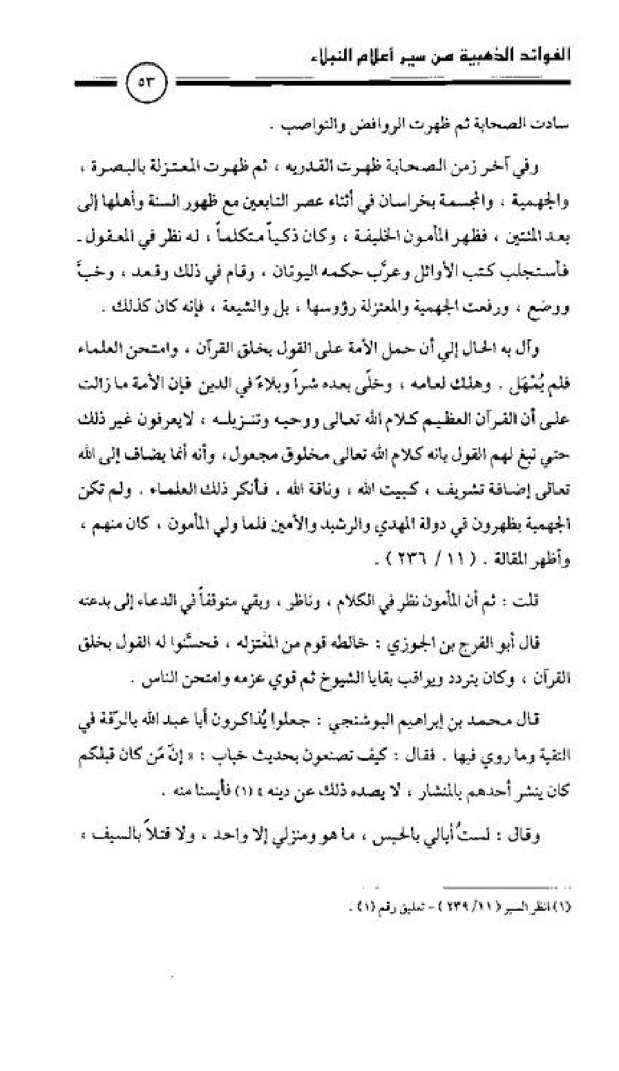 وآل به الحال إلى أن حمل الأمة على القول بخلق القرآن، وامتحن العلماء فلم يُمْهَل وهلك لعامه، وخلي بعده شرًا وبلاء في الدين فإن الأمة ما زالت على أن القرآن العظيم كلام الله تعالى ووحيه وتنزيله لا يعرفون غير ذلك حتى نبغ لهم القول بإنه كلام الله تعالى مخلوق مجعول، وإنه إنما يضاف إلى الله تعالى إضافة تشريف، كبيت الله، وناقة الله، فأنكر ذلك العلماء، ولم تكن الجهمية يظهرون في دولة المهدي والرشيد والأمين فلما ولي المأمون كان منهم، وأظهر المقالة (11/ 236).