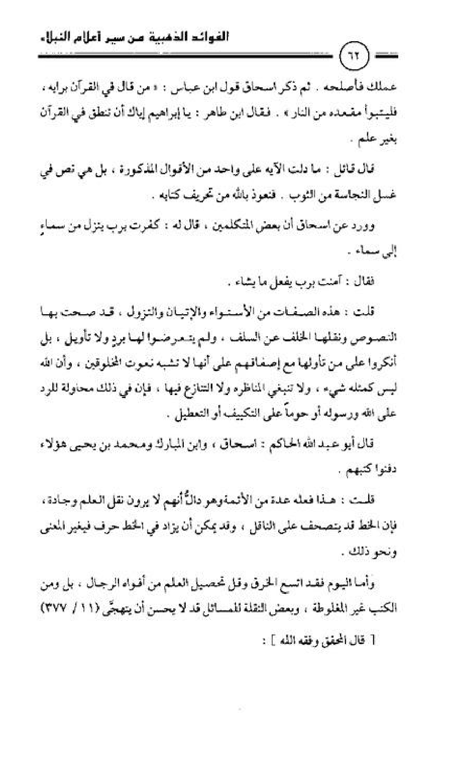 علمك فأصلحه ثم ذكر إسحاق قول ابن عباس: «من قال في القرآن برأيه، فليتبوأ مقعده من النار» فقال ابن طاهر: يا إبراهيم إياك أن تنطق في القرآن بغير علم.