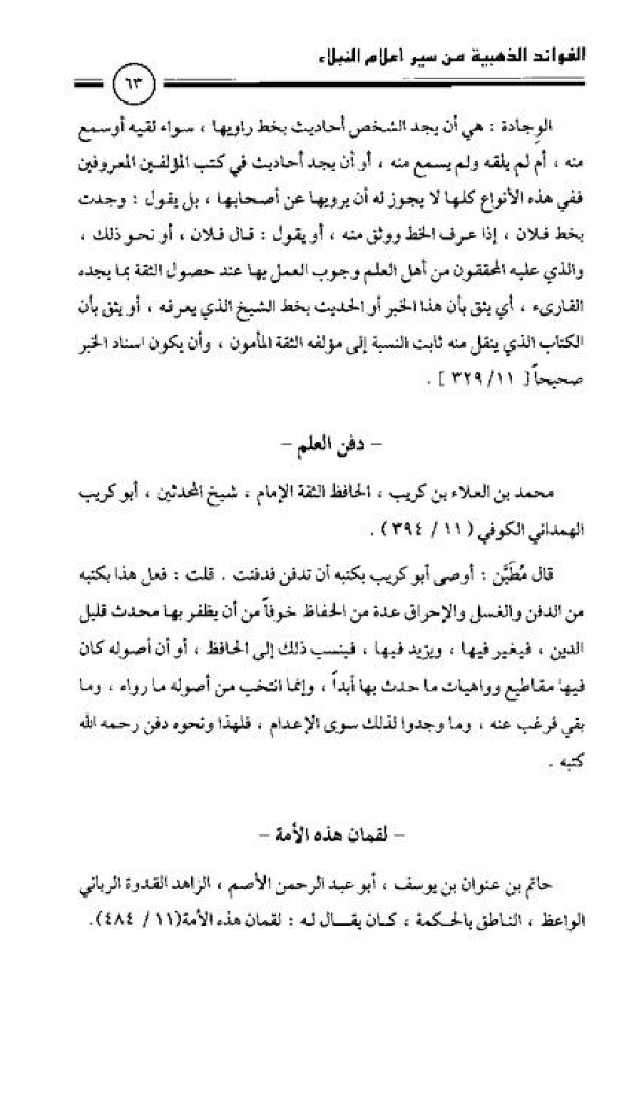 قال مُطين: أوصى أبو كريب بكتبه أن تدفن فدفنت، قلت: فعل هذا بكتبه من الدفن والغسل والإحراق عدة من الحفاظ خوفًا من أن يظفر بها محدث قليل الدين؛ فيغير فيها ويزيد فيها فينسب ذلك إلى الحافظ، أو أن أصوله كانت فيها مقاطيع وواهيات ما حدث بها أبدًا، وإنما انتخب من أصوله ما رواه، وما بقي فرغب عنه، وما وجدوا لذلك سوى الإعدام فلهذا ونحوه دفن رحمه الله كتبه.