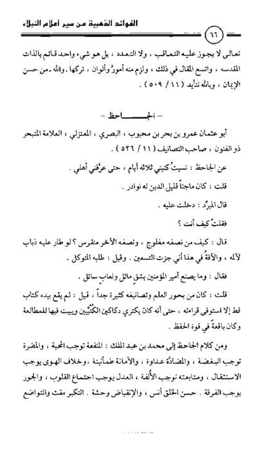 أبو عثمان عمرو بن بحر بن محبوب، البصري، المعتزلي، العلامة المتبحر ذو الفنون، صاحب التصانيف (11/ 526).