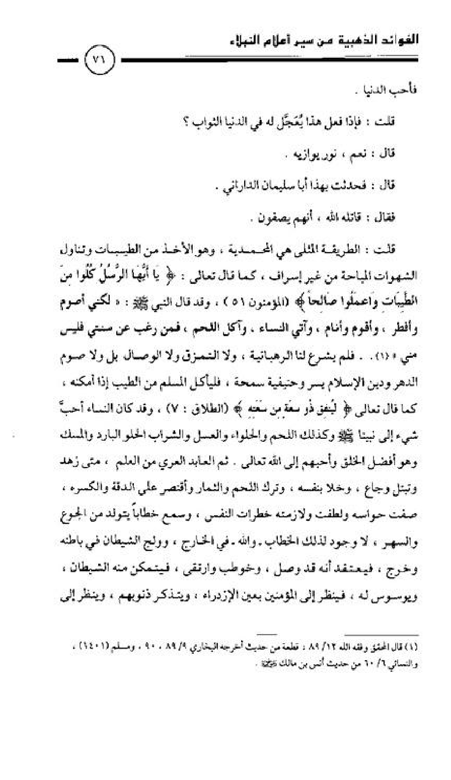 قلت: الطريقة المثلى هي المحمدية وهو الأخذ من الطيبات وتناول الشهوات المباحة من غير إسراف كما قال تعالى: {يَا أَيُّهَا الرُّسُلُ كُلُوا مِنَ الطَّيِّبَاتِ وَاعْمَلُوا صَالِحًا} [المؤمنون: 51] وقد قال النبي - صلى الله عليه وسلم -: «لكني أصوم وأفطر، وأقوم وأنام، وآتي النساء، وآكل اللحم فمن رغب عن سنتي فليس مني» (¬1) فلم يشرع لنا الرهبانية، ولا التمزق ولا الوصال بل ولا صوم الدهر ودين الإسلام يسر وحنيفية سمحة، فليأكل المسلم من الطيب إذا أمكنه كما قال تعالى: {لِيُنْفِقْ ذُو سَعَةٍ مِنْ سَعَتِهِ} [الطلاق: 7] وقد كان النساء أحب شيء إلى نبينا - صلى الله عليه وسلم - وكذلك اللحم والحلواء والعسل والشراب الحلو البارد والمسك وهو أفضل الخلق وأحبهم إلى الله تعالى. ثم العابد العري من العلم، متى زهد وتبتل وجاع، وخلا بنفسه، وترك اللحم والثمار واقتصر على الدقة والكسرة، صفت حواسه ولطفت ولازمته خطرات النفس، وسمع خطابًا يتولد من الجوع والسهر، لا وجود لذلك الخطاب والله في الخارج، وولج الشيطان في باطنه وخرج فيعتقد أنه قد وصل وخوطب وارتقى فيتمكن منه الشيطان، ويوسوس له، فينظر إلى المؤمنين بعين الازدراء ويتذكر ذنوبهم وينظر إلى