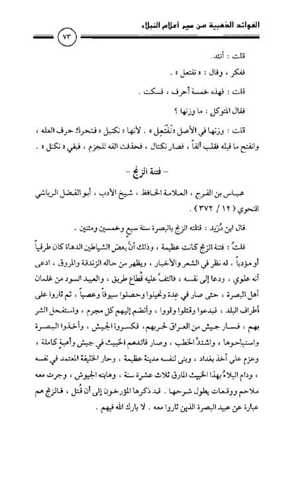 قلتُ: فتنة الزنج كانت عظيمة، وذلك أنَّ بعض الشياطين الدهاة كان طرقيًا أو مؤدبًا له نظر في الشعر والأخبار، ويظهر من حاله الزندقة والمروق، ادعى أنه علوي ودعا إلى نفسه، فالتف عليه قُطاع طريق، والعبيد السود من غلمان أهل البصرة، حتى صار في عدة وتحايلوا وحصلوا سيوفًا وعصيًا، ثم ثاروا على أطراف البلد، فبدعوا وقتلوا وقووا وانضم إليهم كل مجرم واستفحل الشر بهم فسار جيش من العراق لحربهم فكسروا الجيش، وأخذوا البصرة واستباحوها واشتد الخطب، وصار قائدهم الخبيث في جيش وأهبة كاملة، وعزم على أخذ بغداد، وبنى لنفسه مدينة عظيمة، وحار الخليفة المعتمد في نفسه ودام البلاءُ بهذا الخبيث المارق ثلاثة عشرة سنة وهابته الجيوش وجرت معه ملاحم ووقعات يطول شرحها قد ذكرها المؤرخون إلى أن قُتل فالزنج هم عبارة عن عبيد البصرة الذين ثاروا معه لا بارك الله فيهم.