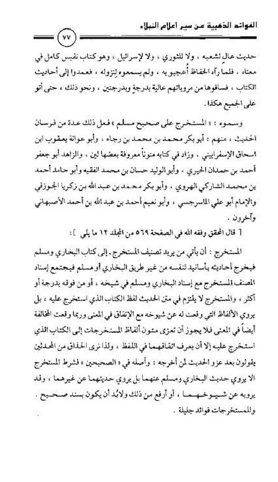 المستخرج: أن يأتي من يريد تصنيف المستخرج إلى كتاب البخاري ومسلم فيخرج أحاديثه بأسانيد لنفسه من غير طريق البخاري أو مسلم فيجتمع إسناد المصنف المستخرج مع إسناد البخاري ومسلم في شيخه، أو من فوقه بدرجة أو أكثر، والمستخرج لا يلتزم في متن الحديث لفظ الكتاب الذي استخرج عليه، بل يروي الألفاظ التي وقعت له عن شيوخه مع الاتفاق في المعنى وربما وقعت المخالفة أيضًا في المعنى فلا يجوز أن تعزى متون ألفاظ المستخرجات إلى الكتاب الذي استخرج عليه إلا أن يعرف اتفاقهما في اللفظ ولذا نرى الحذاق من المحدثين يقولون بعد عزو الحديث لمن أخرجه، وأصله في "الصحيحين" فشرط المستخرج ألا يروي حديث البخاري ومسلم عنها بل يروي حديثهما عن غيرهما، وقد يرويه عن شيوخهما أو أرفع من ذلك ولا بُد أن يكون بسند صحيح، وللمستخرجات فوائد جليلة.