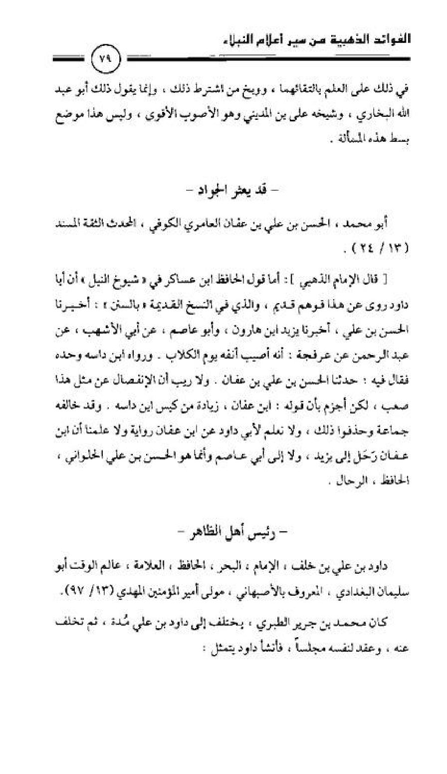 داود بن علي بن خلف، الإمام، البحر، الحافظ، العلامة، عالم الوقت أبو سليمان البغدادي، المعروف بالأصبهاني، مولى أمير المؤمنين المهدي (13/ 97).