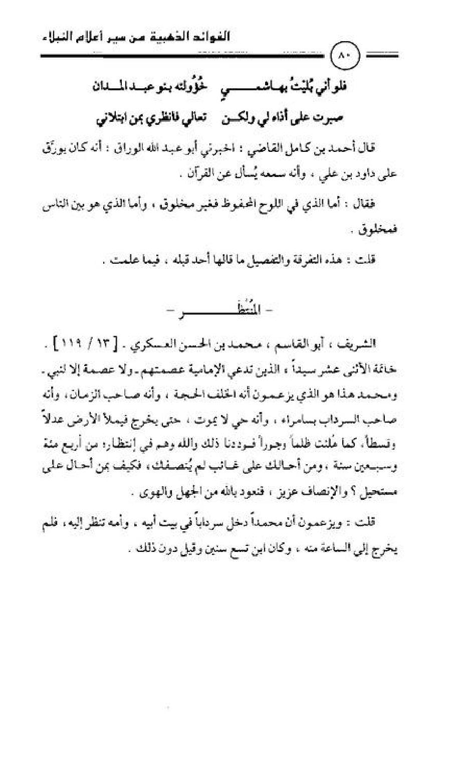 الشريف، أبو القاسم، محمد بن الحسن العسكري (13/ 19). خاتمة الاثنى عشر سيدًا الذين تدعي الإمامية عصمتهم ولا عصمة إلا لنبي ومحمد هذا هو الذي يزعمون أنه الخلف الحجة، وأنه صاحب الزمان، وأنه صاحب السرداب بسامراء، وأنه حي لا يموت، حتى يخرج فيملأ الأرض عدلا وقسطًا كما مُلئت ظلمًا وجورًا فوددنا ذلك والله وهم في انتظاره من أربعمائة وسبعين سنة، ومن أحالك إلى غائب لم يُنصفك فكيف بمن أحال على مستحيل؟ والإنصاف عزيز، فنعود بالله من الجهل والهوى.