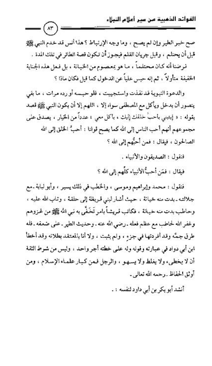 فنقول: محمد وإبراهيم وموسى، والخطب في ذلك يسير، وأبو لبابة، مع جلالته بدت منه خيانة، حيث أشار لبني قريظة إلى حلقة، وتاب الله عليه، وحاطب بدت منه خيانة فكاتب قريشًا بأمر تَخفى به نبي الله - صلى الله عليه وسلم - من غزوهم وغفر الله لحاطب مع عظم فعله رضي الله عنه وحديث الطير على ضعفه فله طرق جمة وقد أفردتها في جزء، ولم يثبت، ولا أنا بالمعتقد بطلانه وقد أخطأ ابن أبي داود في عبارته وقوله وله على خطئه أجر واحد، وليس من شرط الثقة أن لا يخطئ ولا يغلط ولا يسهو، والرجل فمن كبار علماء الإسلام ومن أوثق الحفاظ رحمه الله تعالى.