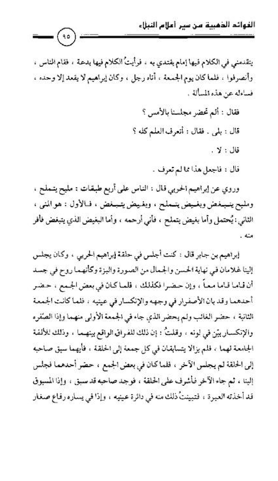 إبراهيم بن جابر قال: كنت أجلس في حلقة إبراهيم الحربي، وكان يجلس إلينا غلامان في نهاية الحسن والجمال من الصورة والبزة وكأنهما روح في جسد إن قاما قاما معًا، وإن حضرا فكذلك، فلما كان في بعض الجمع، حضر أحدهما وقد بان الاصفرار في وجهه والانكسار في عينيه، فلما كانت الجمعة الثانية، حضر الغائب ولم يحضر الذي جاء في الجمعة الأولى منهما وإذا الصفرة والانكسار بَيِّنان في لونه، وقلتُ: إن ذلك للفراق الواقع بينهما وذلك للألفة الجامعة لهما فلم يزالا يتسابقان في كل جمعة إلى الحلقة، فأيهما سبق صاحبه إلى الحلقة لم يجلس الآخر، فلما كان في بعض الجمع، حضر أحدهما فجلس إلينا، ثم جاء الآخر فأشرف على الحلقة، فوجد صاحبه قد سبق، وإذا المسبوق قد أخذته العبرة، فتبينت ذلك منه في دائرة عينيه، وإذا في يساره رقاع صغار