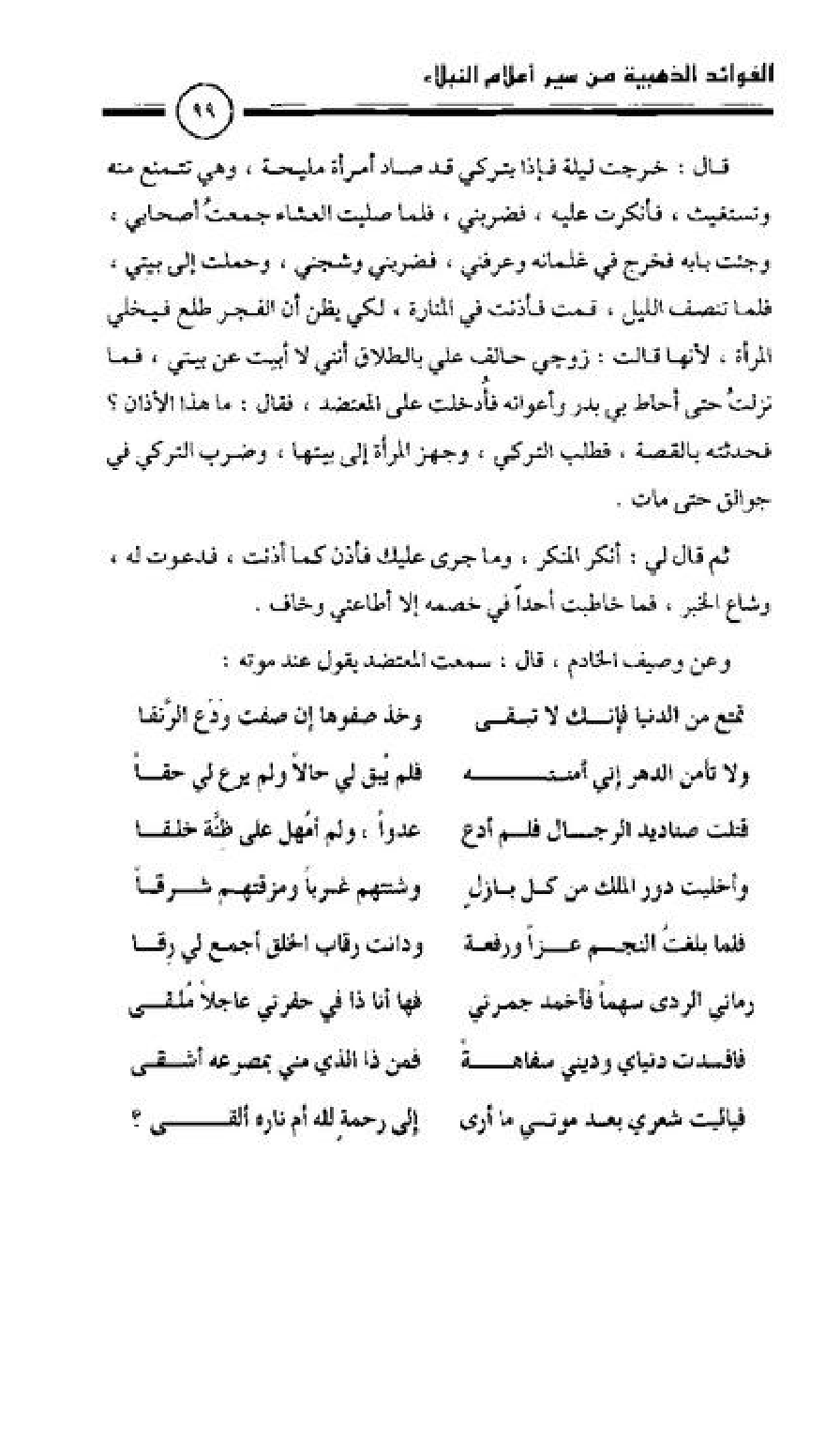 وعن وصيف الخادم قال: سمعت المعتضد يقول عند موته: