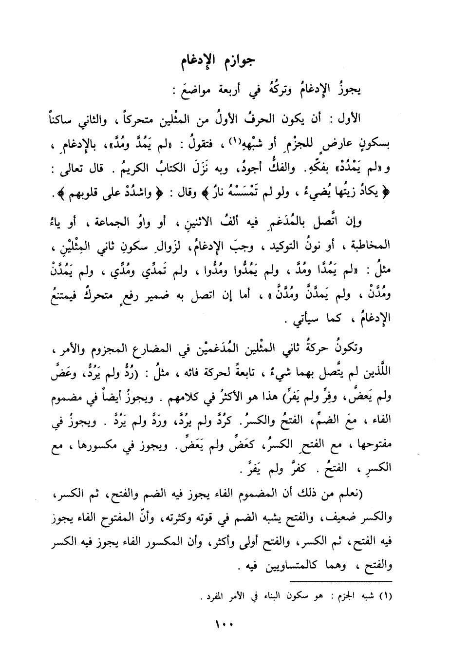 الأول أن يكون الحرفُ الأولُ من المثْلين متحركاً، والثاني ساكناً بسكونٍ عارضٍ للجزْمِ أو شبْههِ، فتقولُ "لم يَمُدَّ ومُدَّ"، بالإِدغامِ، و"لم يَمْدُدْ" بفكّهِ. والفكُّ أجودُ، وبه نَزَلَ الكتابُ الكريمُ. قال تعالى {يكادُ زيتُها يُضيءُ، ولو لم تَمْسَسْه نارٌ} وقال {واشدُدْ على قلوبهم} .