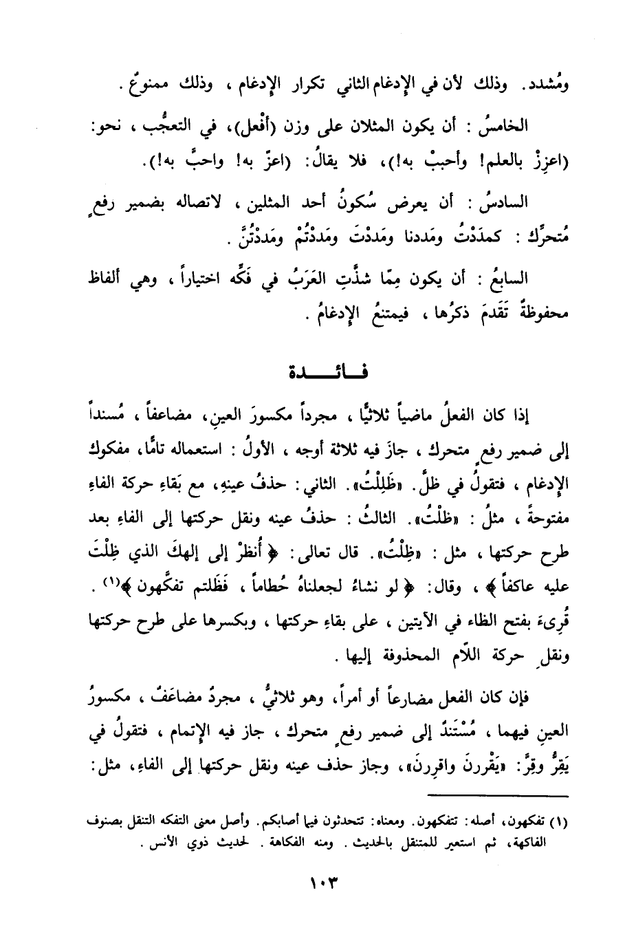 إذا كان الفعلُ ماضياً ثلاثيًّا، مجرداً مكسورَ العينِ، مضاعفاً، مُسنداً إلى ضمير رفعٍ متحرك، جازَ فيه ثلاثة أوجه، الأولُ استعماله تامًّا، مفكوك الإدغام، فتقولُ في ظلَّ. "ظَلِلْتُ". الثاني حذفُ عينهِ، مع بَقاءِ حركة الفاءِ مفتوحةً، مثلُ "ظلْتُ". الثالثُ حذفُ عينه ونقل حركتها إلى الفاءِ بعد طرح حركتها، مثل "ظِلْتُ". قال تعالى {أُنظرْ إلى إِلهكَ الذي ظِلْتَ عليه عاكفاً} ، وقال {لو نشاءُ لجعلناهُ حُطاماً، فَظَلتم تفكَّهون} . قُرِئَ بفتح الظاء في الآيتين، على بقاءِ حركتها، وبكسرها على طرح حركتها ونقلِ حركة اللام المحذوفة إليها.