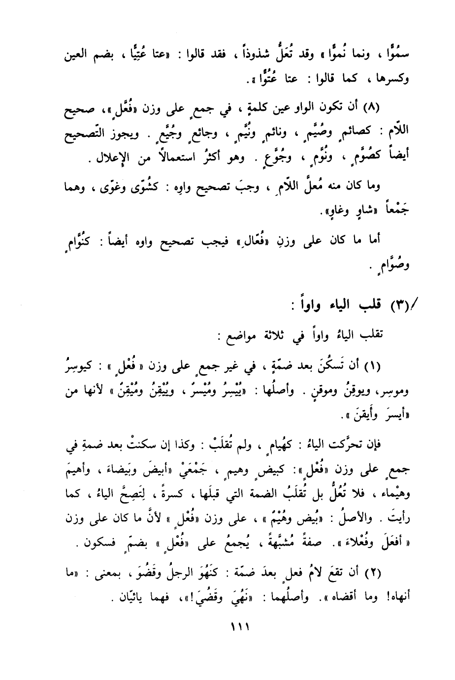 فإن تحرَّكت الياءُ كهُيامٍ، لم تُقلَبْ وكذا إن سكنتْ بعد ضمةِ في جمعٍ على وزن "فُعْلٍ" كبيضٍ وهيمٍ، جَمْعَيْ "أبيضَ وبَيضاءَ، وأهيمَ وهيْماء، فلا تُعُلُّ بل تُقلَبُ الضمة التي قبلَها، كسرةً، لِتَصِحَّ الياءُ، كما رأيتَ. والأصلُ "بُيض وهُيْمٌ"، على وزن "فُعْلٍ" لأنَّ ما كان على وزن "أفعَلَ وفُعْلاءَ". صفةً مُشبَّهةً، يُجمعُ على "فُعْلٍ" بضمٍّ فسكون.