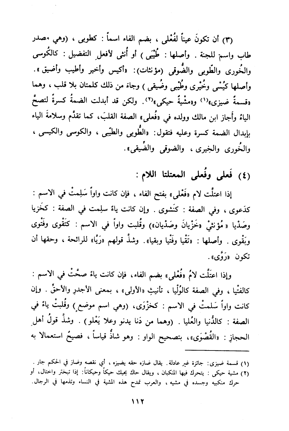 وإذا اعتَلَّت لامُ "فُعْلى" بضم الفاء، فإن كانت ياءً صحَّتْ في الاسم كالفتْيا، وفي الصفة كالوُليْا، تأنيتِ "الأولى"، بمعنى الأجدرِ والأحقِّ. وإن كانت واواً سَلمتْ في الاسم كخزْوَى، (وهي اسم موضعٍ) وقُلبتْ ياءً في الصفة كالدُّنيا والعُليا. (وهما من دَنا يدنو وعلا يَعْلو) , وشذَّ قولُ أهلِ الحجازِ "القُصْوَى"، بتصحيح الواو وهو شاذٌّ قياساً، فصيحٌ استعمالا به