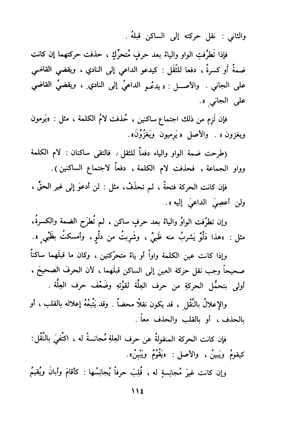 فإذا تَطرَّفتِ الواو والياءُ بعد حرفٍ مُتحرِّكٍ، حذفت حركتهما إنه كانت ضمةً أَو كسرةً، دفعا للثَقَل كيدعو الداعي إلى النادي، ويقضي القاضي على الجاني. والأصل "يدعُو الداعيُ إلى الناديِ، ويقضيُ القاضي على الجانيِ".