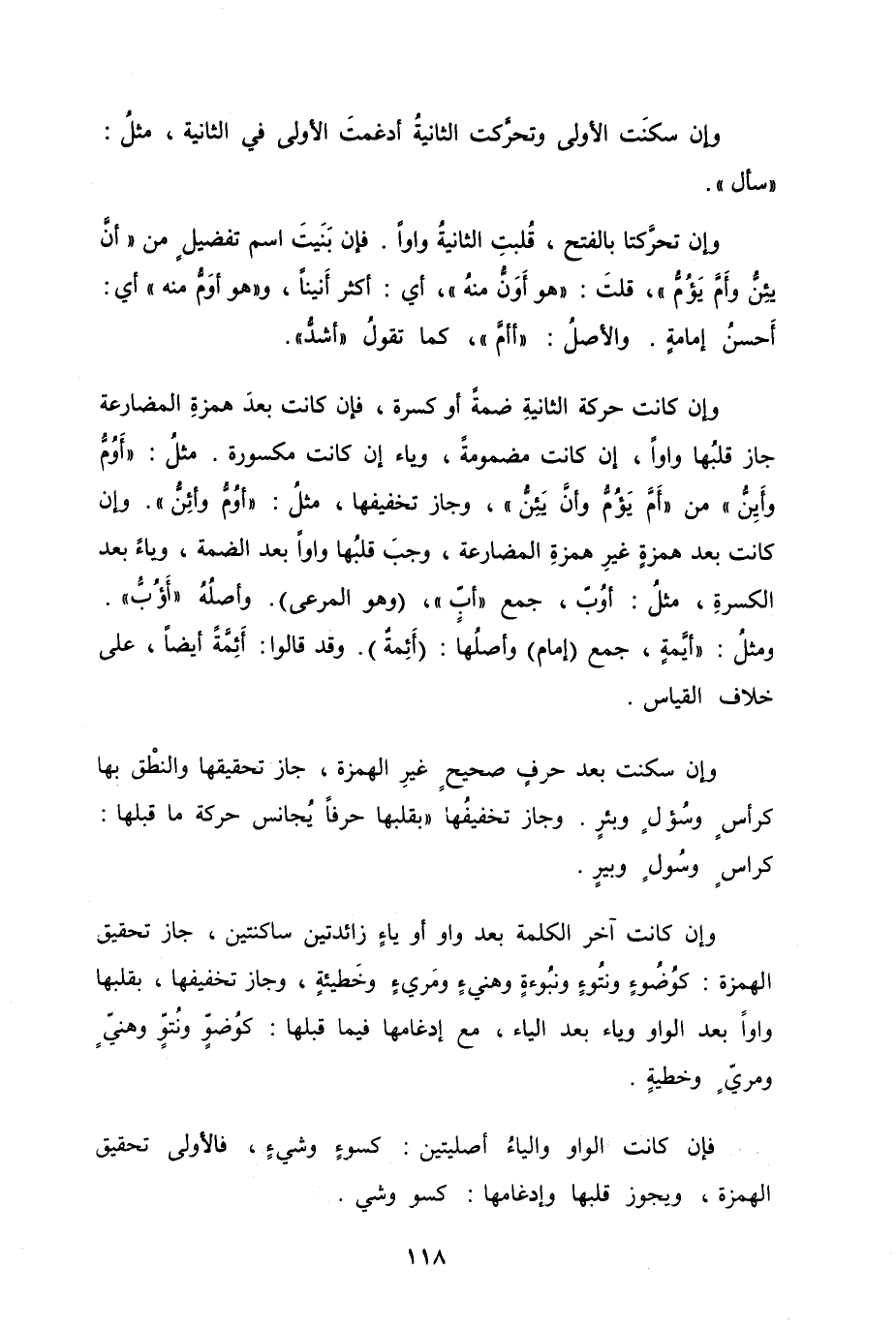 وإن كانت حركة الثانيةِ ضمةً أو كسرة، فإن كانت بعدَ همزةِ المضارعة جاز قلبُها واواً، إن كانت مضمومةً، وياء إن كانت مكسورة. مثلُ "أَوُمُّ وأَيِنُّ" من "أَمَّ يَؤُمُّ وأنَّ يَئِنُّ"، وجاز تخفيفها، مثلُ "أوُمُّ وأئِنُّ". وإن كانت بعد همزةٍ غيرِ همزةِ المضارعة، وجبَ قلبُها واواً بعد الضمة، وياءً بعد الكسرةِ، مثلُ أوُبّ، جمع "أبٍّ"، (وهو المرعى) . وأصلُهُ "أؤُبُّ". ومثلُ أيمَّةٍ، جمع (إمام) وأصلُها (أَئِمةٌ) . وقد قالوا أئِمَّةً أيضاً، على خلاف القياس.