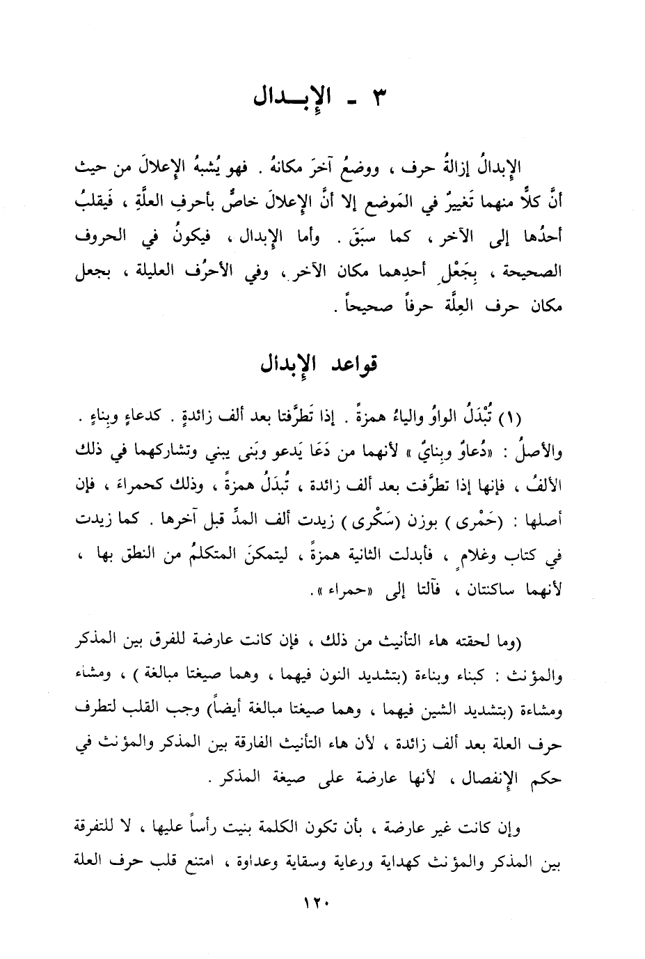 الإبدالُ إزالةُ حرف، ووضعُ آخرَ مكانهُ. فهو يُشبهُ الإعلالَ من حيث أنَّ كلاًّ منهما تَغييرٌ في المَوضع إلا أنَّ الإعلالَ خاصٌّ بأحرفِ العلَّةِ، فيقلبُ أحدُها إلى الآخر، كما سبَقَ. وأما الإبدال، فيكونُ في الحروف الصحيحة، بِجَعْلِ أحدِهما مكان الآخر، وفي الأحرُف العليلة، بجعل مكان حرف العِلَّة حرفاً صحيحاً.