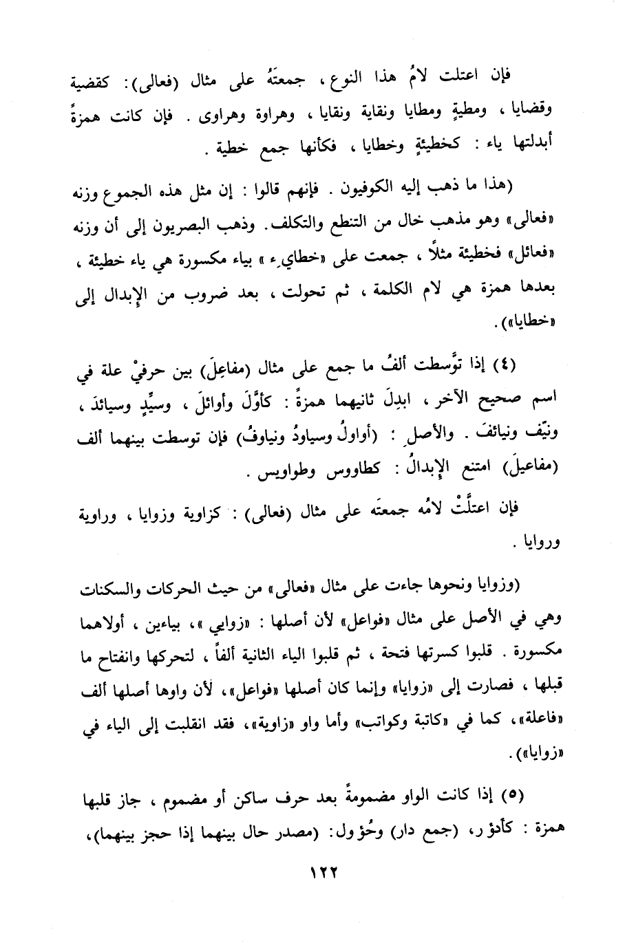 (هذا ما ذهب إليه الكوفيون. فإنهم قالوا إن مثل هذه الجموع وزنه "فعالى" وهو مذهب خال من التنطع والتكلف. وذهب البصريون إلى أن وزنه "فعائل" فخطيئة مثلا، جمعت على "خطايِء" بياء مكسورة هي ياء خطيئة، بعدها همزة هي لام الكلمة، ثم تحولت، بعد ضروب من الإبدال إلى "خطايا") .