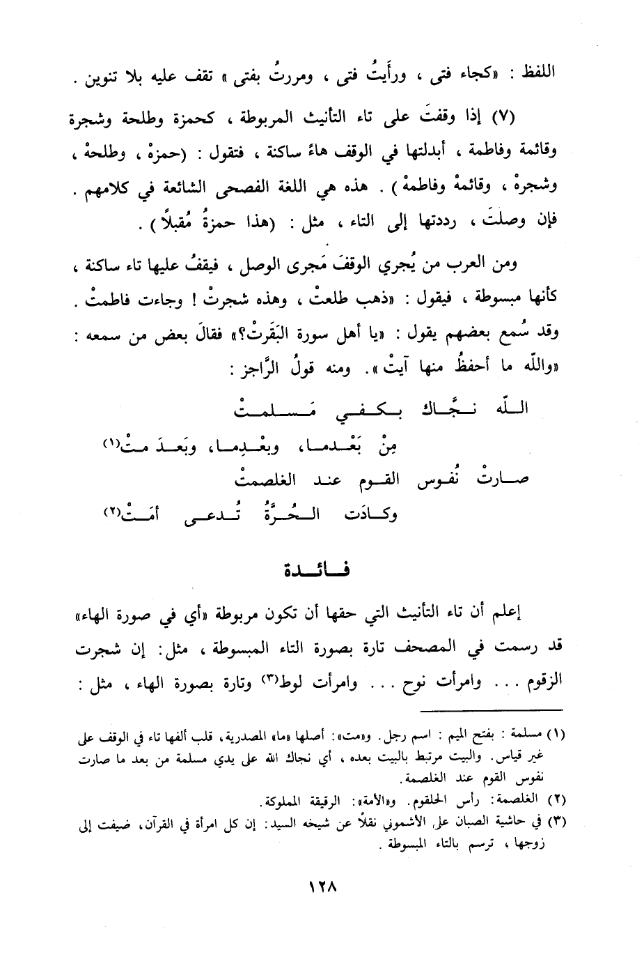 اعلم أن تاء التأنيث التي حقها ان تكون مربوطة "أي في صورة الهاء" قد رسمت في المصحف تارة بصورة التاء المبسوطة، مثل إن شجرت الزقوم ... وامرأت نوح ... وامرأت لوط وتارة بصورة الهاء، مثل