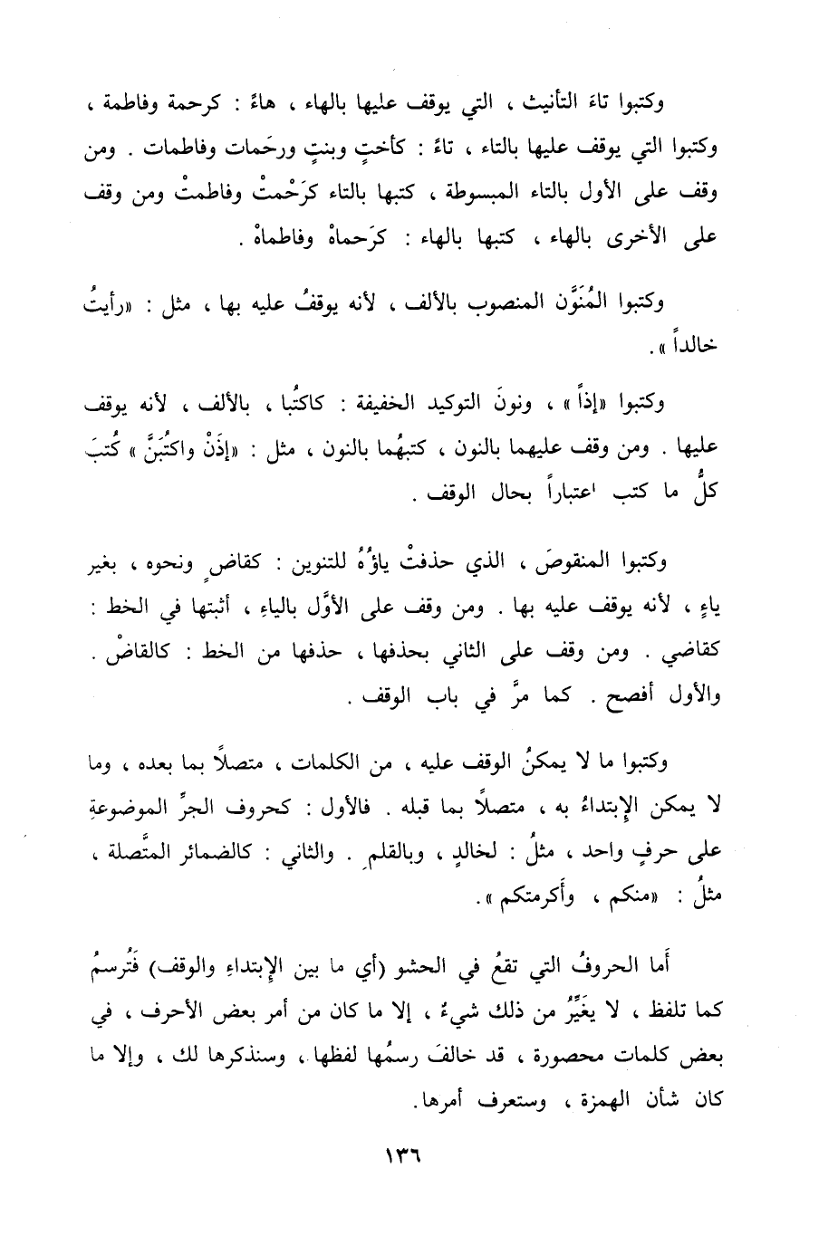 أَما الحروفُ التي تقعُ في الحشو (أي ما بين الابتداءِ والوقف) فَتُرسمُ كما تلفظ، لا يغَيَّرُ من ذلك شيءٌ، إلا ما كان من أمر بعض الأحرف، في بعض كلمات محصورة، قد خالفَ رسمُها لفظها، وسنذكرها لك، وإلا ما كان شأن الهمزة، وستعرف امرها.