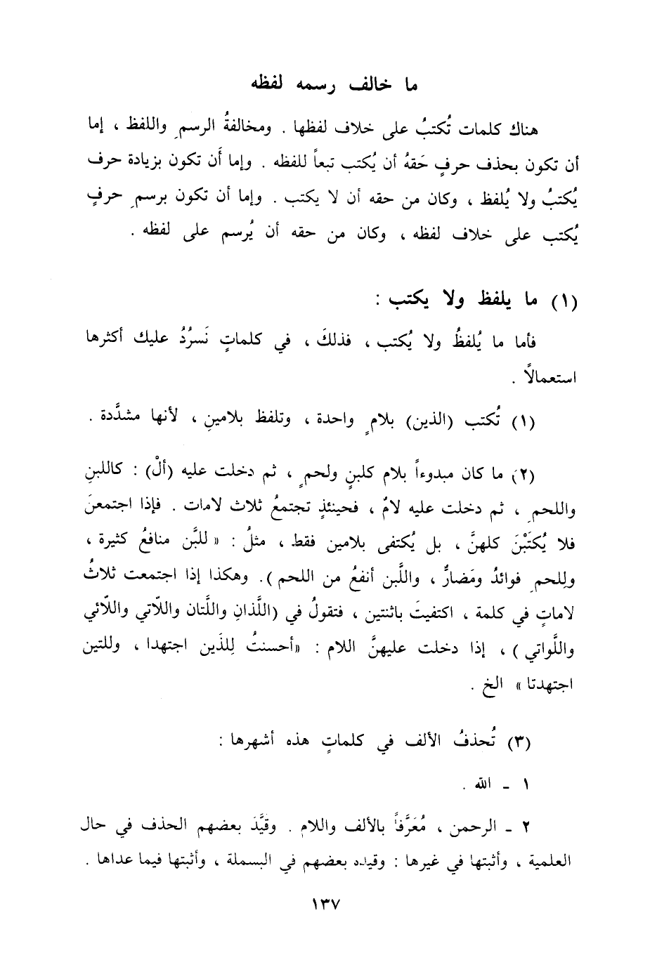 هناك كلمات تُكتبُ على خلاف لفظها. ومخالفةُ الرسمِ واللفظ، إما أن تكون بحذف حرفٍ حَقهُ أن يُكتب تبعاَ للفظه. وإما أَن تكون بزيادة حرف يكتبُ ولا يُلفظ، وكان من حقه ان لا يكتب. وإما ان تكون برسمِ حرفٍ يُكتب على خلاف لفظه، وكان من حقه ان يُرسم على لفظه.