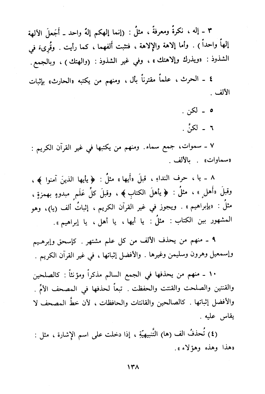 9- منهم من يحذف الالف من كل علم مشتهر. كإسحق وإبرهيم وإسمعيل وهرون وسليمن وغيرها. والافضل إثباتها، في غير القرآن الكريم.
