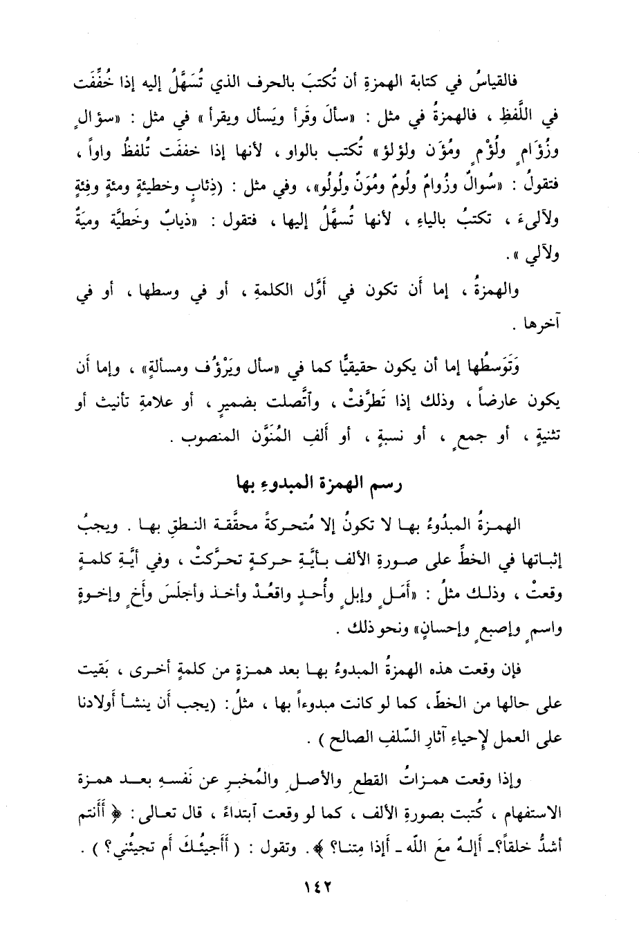 الهمزةُ المبدُوءُ بها لا تكونُ إلا مُتحركةً محقَّقة النطقِ بها. ويجبُ إثباتها في الخطِّ على صورةِ الألف بأيَّةِ حركةٍ تحرَّكتْ، وفي أيَّةِ كلمةٍ وقعتْ، وذلك مثلُ "أمَلٍ وإبلٍ وأحُدٍ واقعُدْ وأخذ وأجلَسَ وأَخٍ وإخوةٍ وإسمٍ وإصبعٍ وإحسانٍ" ونحو ذلك.