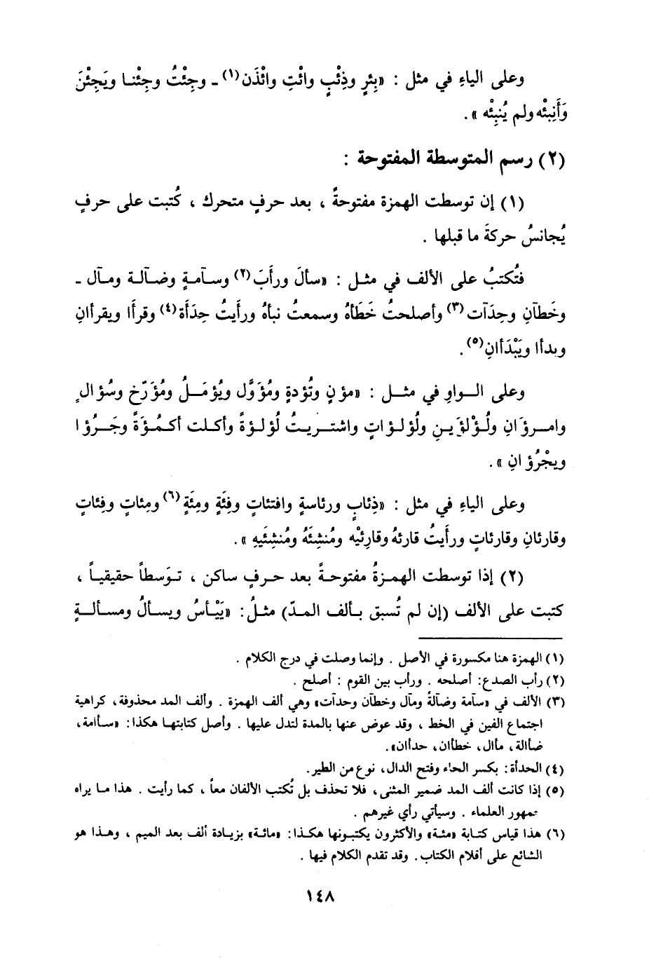 وعلى الياءِ في مثل "ذِئابٍ ورئاسةٍ وافتئاتٍ وفِئَةٍ ومِئَةٍ ومِئاتٍ وفِئاتٍ وقارِئانِ وقارئاتٍ ورأَيتُ قارئةُ وقارئَيْه ومُنشِئَهُ ومُنشِئَيهِ".