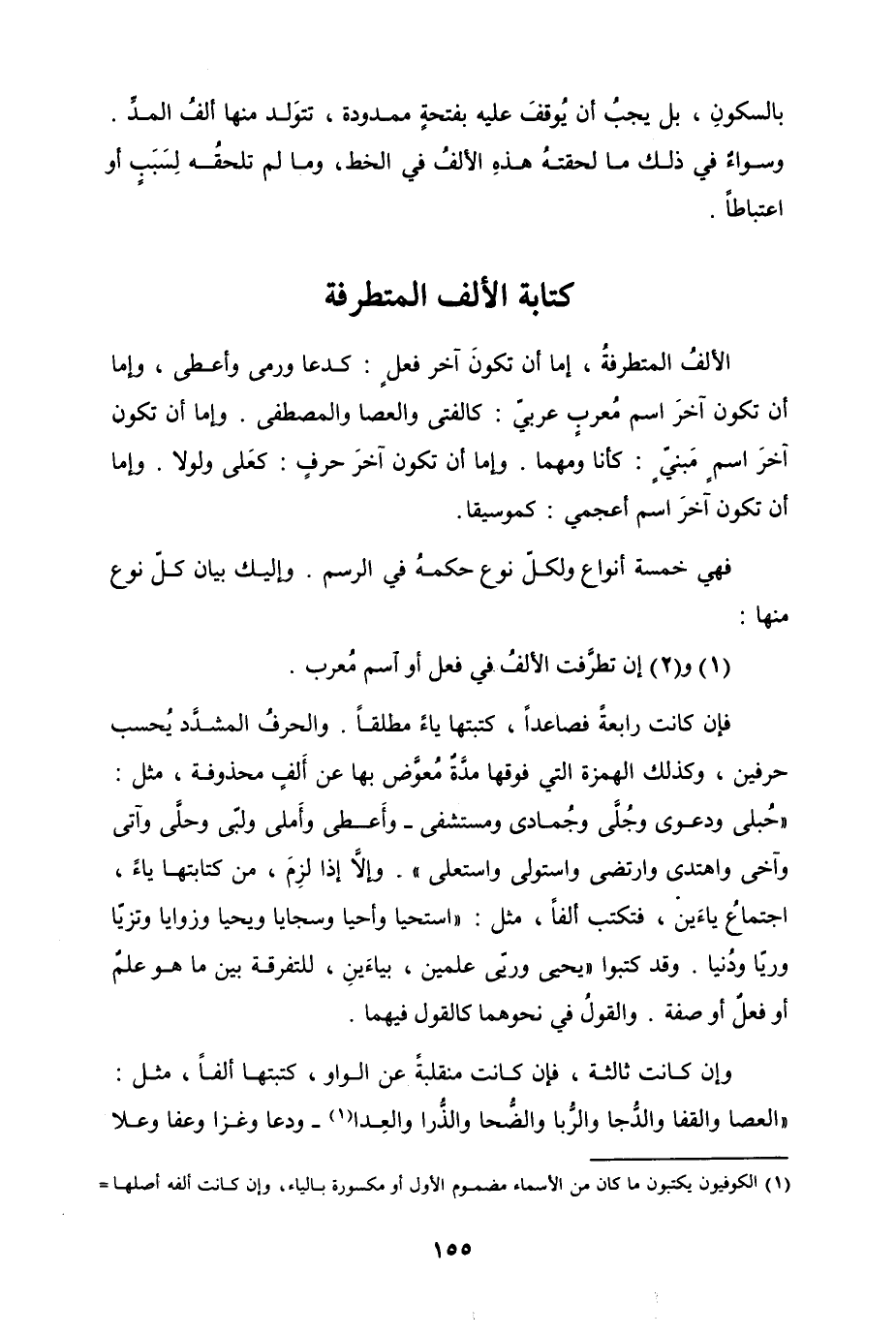 الالفُ المتطرفةُ، إما أن تكونَ آخرَ فعلٍ كدعا ورمى وأعطى، وإما أن تكون آخرَ اسم مُعربٍ عربيّ كالفتى والعصا والمصطفى. وإما أن تكون آخرَ اسمٍ مَبنيٍّ كأنا ومهما. وإما أن تكون آخرَ حرفٍ كعَلى ولولا. وإما أن تكون آخرَ اسم أعجمي كموسيقا.