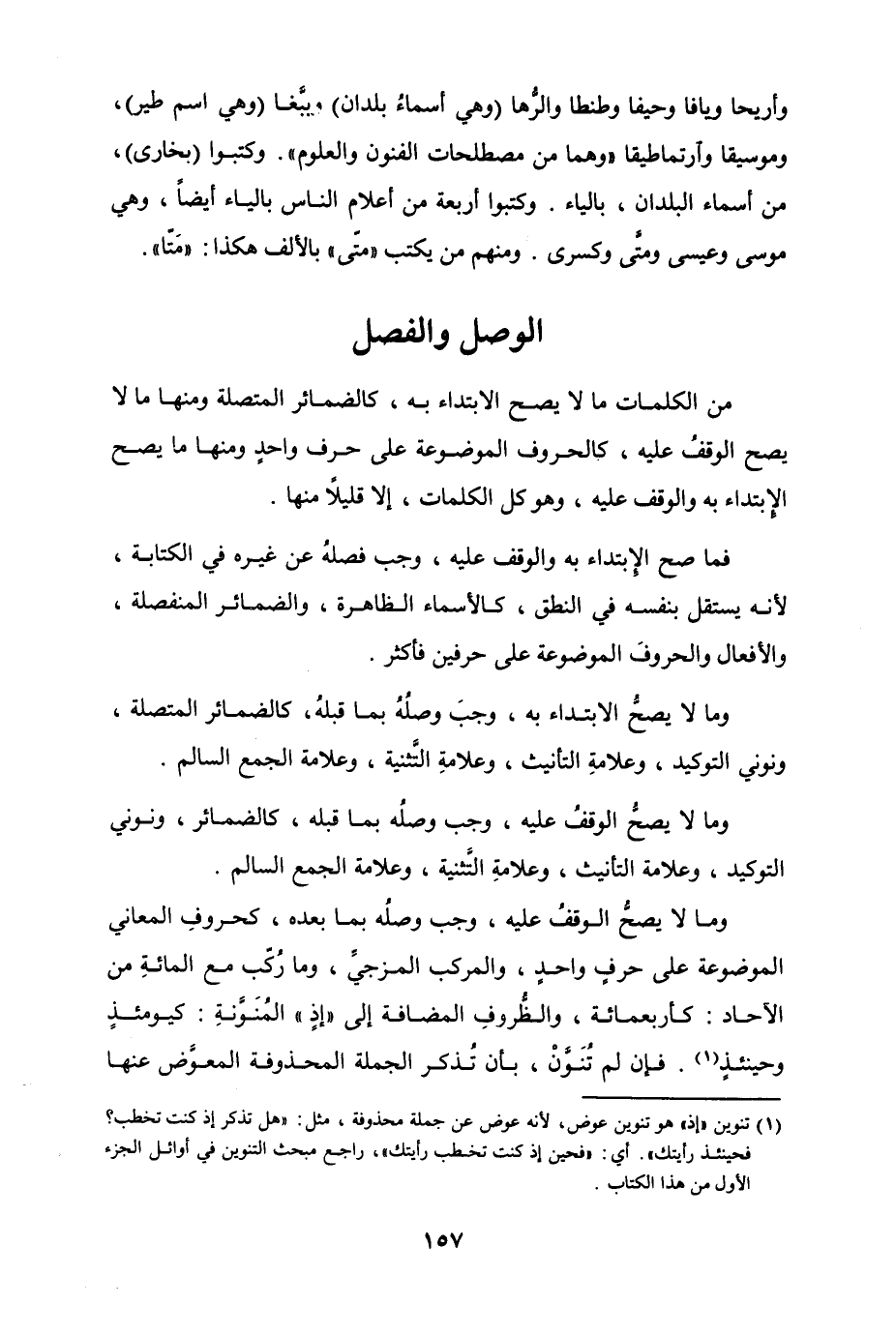 وما لا يصحُّ الوقفُ عليه، وجب وصلُه بما بعده، كحروفِ المعاني الموضوعة على حرفٍ واحدٍ، والمركب المزجيِّ، وما رُكّب مع المائة من الآحاد كأربعمائة، والظُّروفِ المضافة إلى "إذٍ" المُنَوَّنةِ كيومئذٍ وحينئذٍ. فإن لم تُنَوَّنْ، بأن تُذكر الجملة المحذوفة المعوَّض عنها