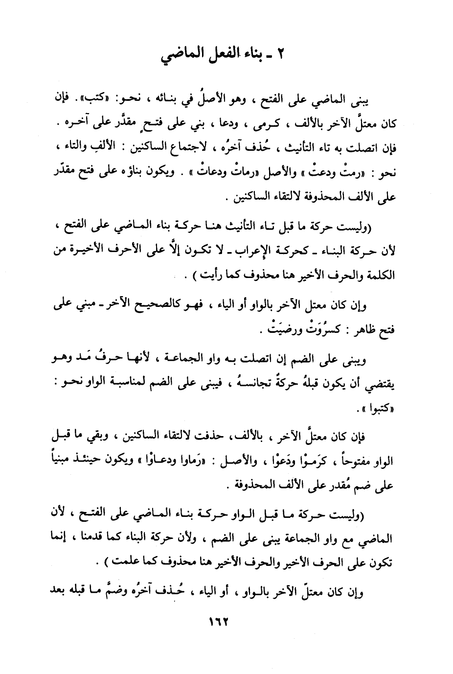 يبنى الماضي على الفتح، وهو الأصلُ في بنائه، نحو "كتب". فإن كان معتلَّ الآخر بالألف، كرمى، ودعا، بني على فتحٍ مقدَّر على آخره. فإن اتصلت به تاء التأنيث، حُذف آخرُه، لاجتماع الساكنين الألفِ والتاء، نحو "ردتْ ودعتْ" والأصل "رماتْ ودعاتْ". ويكون بناؤه على فتح مقدّر على الألف المحذوفة لالتقاء الساكنين.