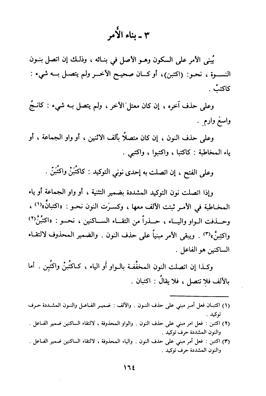 وعلى حذف النون، إن كان متصلا بألف الاثنين، أو واو الجماعة، أو ياء المخاطبة كاكتبا، واكتبوا، واكتبي.
