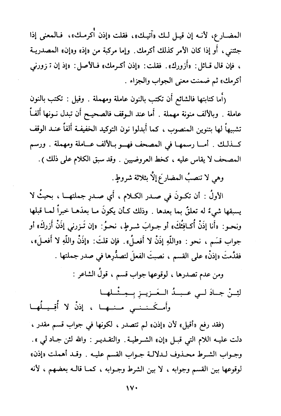الأولُ أَن تكونَ في صدر الكلام، أَي صدرِ جملتها، بحيثُ لا يسبقها شيءٌ له تعلقٌ بما بعدها. وذلك كأن يكونَ ما بعدَها خبراً لما قبلها ونحو "أَنا إذَنْ أُكافِئُكَ" أَو جوابَ شرطٍ، نحوُ "إن تُزرني إذَنْ أَزركَ" أَو جواب قسمَ، نحو "واللهِ إذَنْ لا أَفعلُ". فإن قلتَ "إذَنْ واللهِ لا أَفعلَ"، فقدَّمتَ "إذنْ" على القسم، نصبتَ الفعلَ لتصدُّرِها في صدر جملتها.