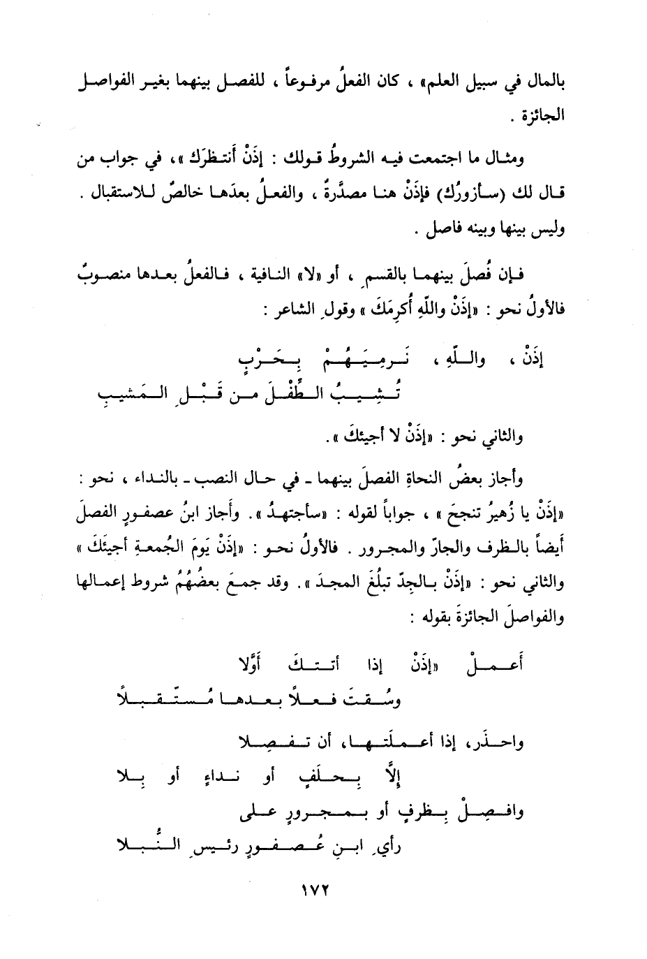 فإن فُصلَ بينهما بالقسمِ، أو "لا" النافية، فالفعلُ بعدها منصوبٌ. فالأولُ نحو "إذَنْ واللهِ أُكرِمَكَ" وقولِ الشاعر [من الوافر]