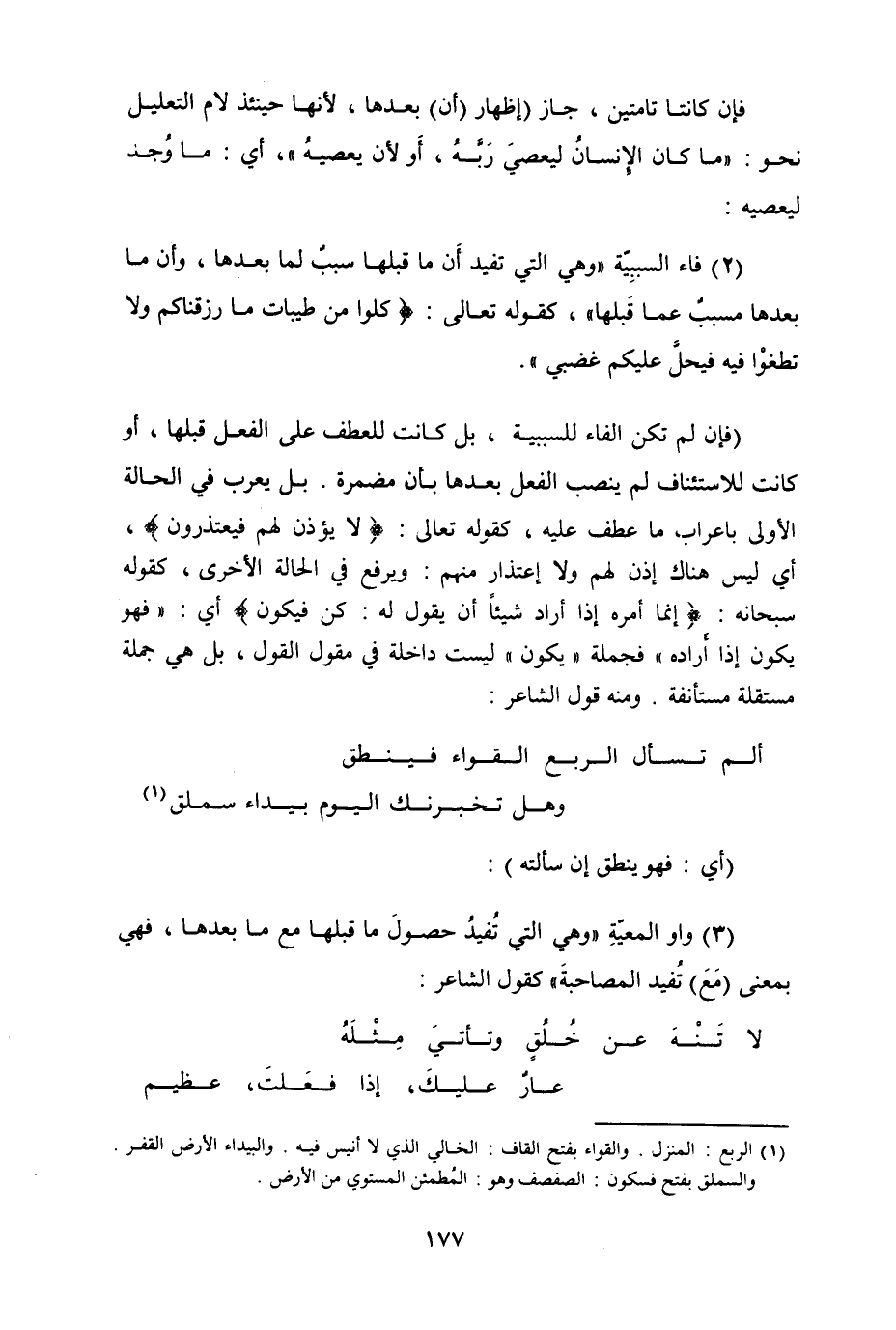 (2) فاء السببِيّة "وهي التي تفيد أَن ما قبلها سببٌ لما بعدها، وأَن ما بعدها مسببٌ عما قَبلها"، كقوله تعالى {كلوا من طيبات ما رزقناكم ولا تطغوْا فيه فيحلَّ عليكم غضبي} .