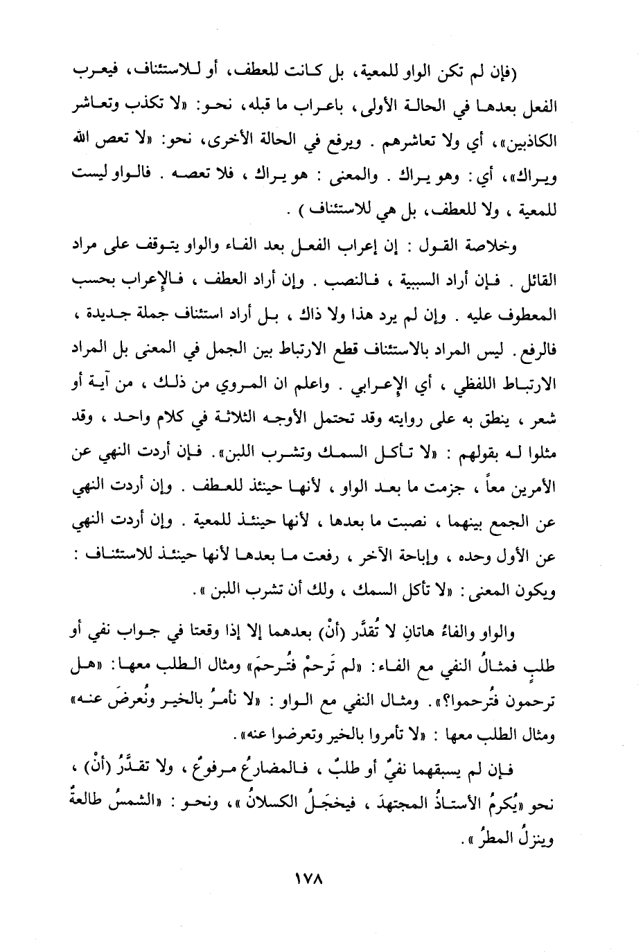 وخلاصة القول إن إعراب الفعل بعد الفاء والواو يتوقف على مراد القائل. فإن أراد السببية، فالنصب. وإن أراد العطف، فالإعراب بحسب المعطوف عليه. وإن لم يرد هذا ولا ذاك، بل أراد استئناف جملة جديدة، فالرفع ليس المراد بالاستئناف قطع الارتباط بين الجمل في المعنى بل المراد الارتباط اللفظي، أي الإعرابي. واعلم ان المروي من ذلك، من آية أو شعر، ينطق به على روايته وقد تحتمل الأوجه الثلاثة في كلام واحد، وقد مثلوا له بقولهم "لا تأكل السمك وتشرب اللبن". فإن أردت النهي عن الأمرين معاً، جزمت ما بعد الواو، لأنها حينئذ للعطف. وإن أردت النهي عن الجمع بينهما، نصبت ما بعدها، لأنها حينئذ للمعية. وإن أردت النهي عن الأول وحده، وإباحة الآخر، رفعت ما بعدها لأنها حينئذ للاستئناف ويكون المعنى "لا تأكل السمك، ولك أن تشرب اللبن".